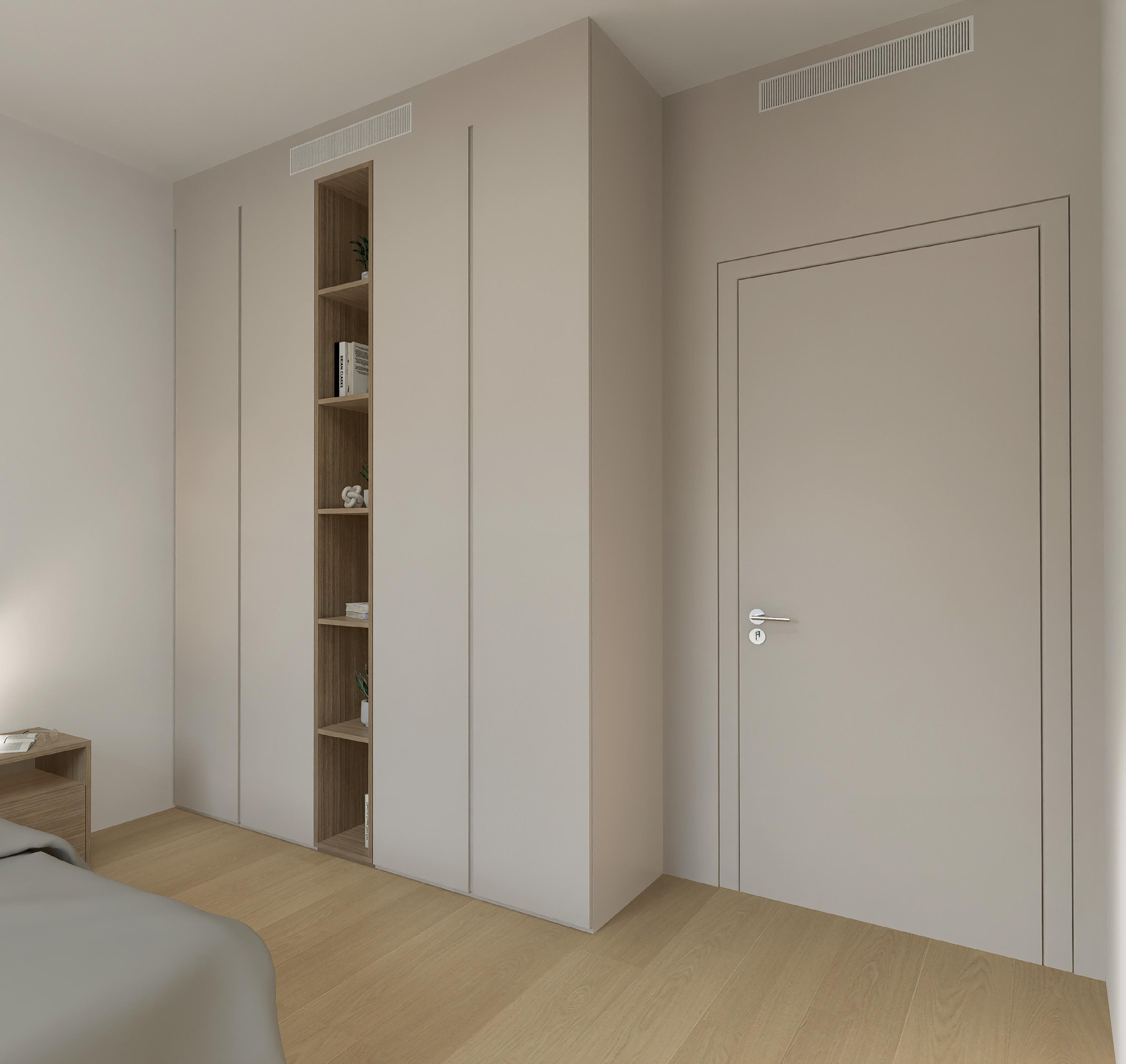 Rebateless door leaf, CPL surface finish, lightweight chipboard filling, for a panel frame with concealed 3D hinges and magnetic lock.