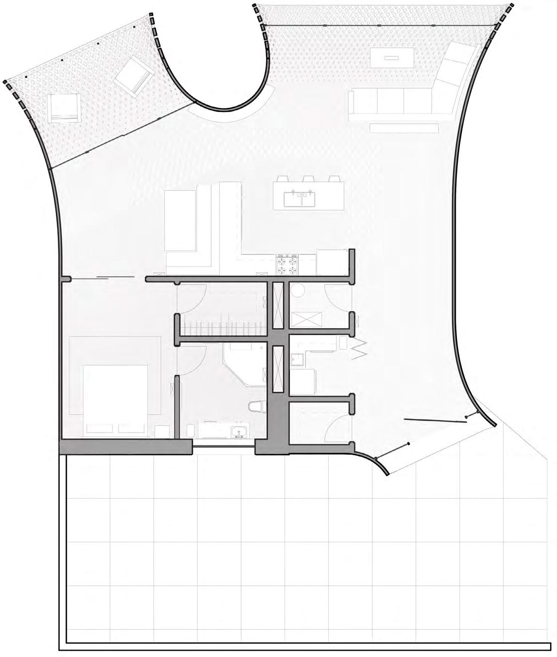The design’s programmatic layout is intricately linked to the opacity of the S-Glass threading, where spaces allowing more light embrace a public nature, contrasting with tightly woven, private areas. Supported by a concrete core, the house features expansive overhangs made possible by the lightweight yet robust nature of the composite material, enhancing aesthetics and functionality.