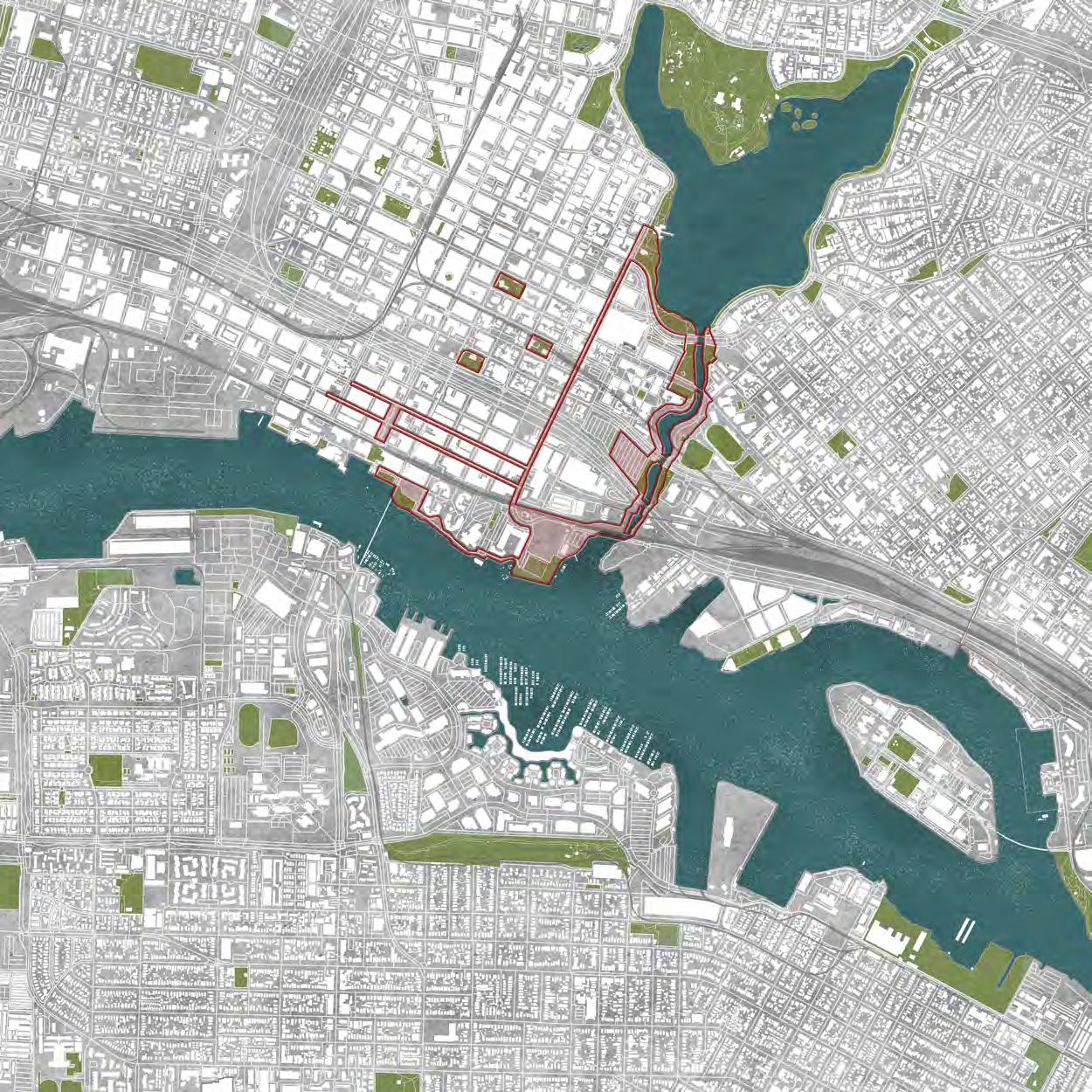 The master plan aims to align with Oakland’s dual identity as a resilient community and an industrial harbor town. Adaptive urban design techniques promote flexibility and sustainability, with modular shipping containers moved to inland parks to avoid flooding, and coastal areas equipped with durable materials like shading structures and art installations.