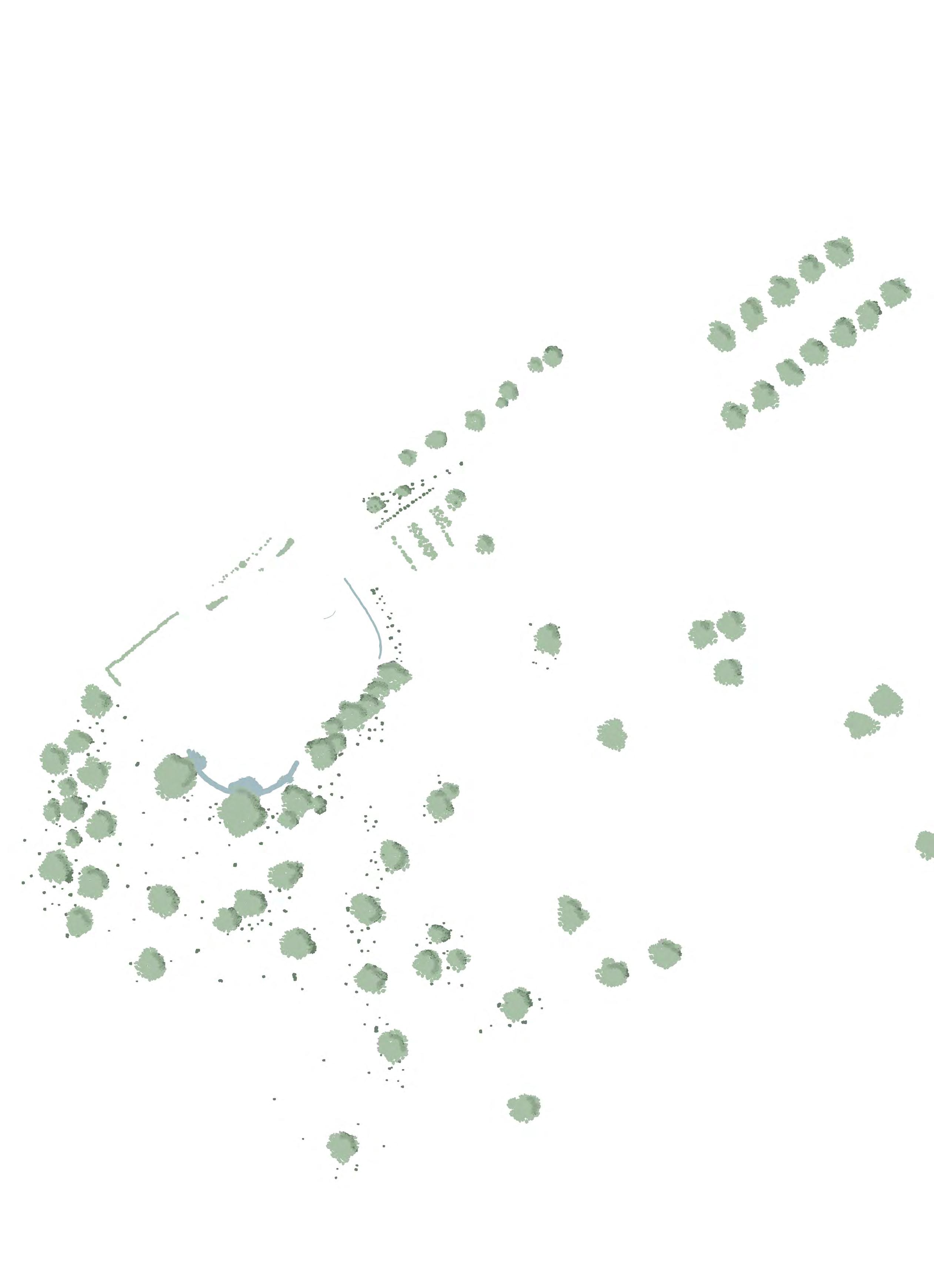 The manipulation of topography, besides addressing runoff concerns, forms a bioswale, featuring “The Oasis” pond for water storage. Abundant water fosters diverse vegetation, positively impacting mental health. Design decisions prioritize well-being, incorporating open workspaces, tall ceilings, visual connections to nature, and integration with natural systems.