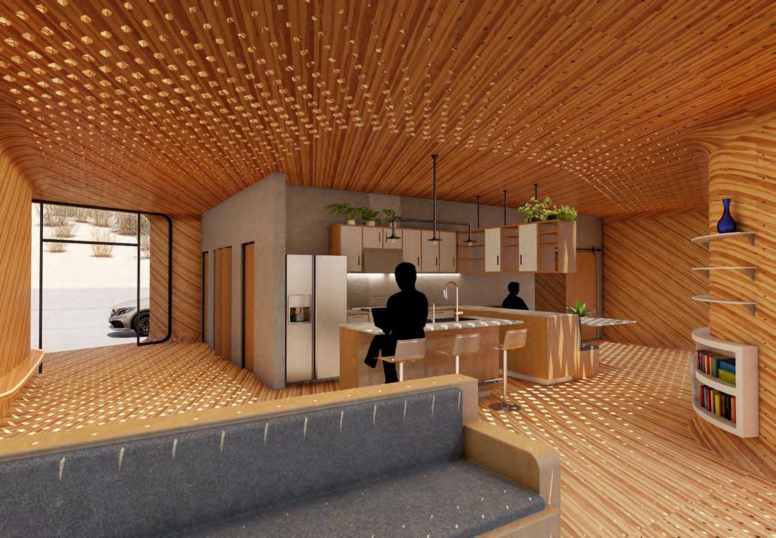 Hill House, situated on Sentinal Peak in Tucson, Arizona, reimagines architectural fabrication by drawing inspiration from aerospace engineering. Utilizing prefabricated shells made of S-Glass, a composite material with an oaky texture, the project explores innovative structural and thermal elements. This approach grants the architect meticulous control over openings and structural features.