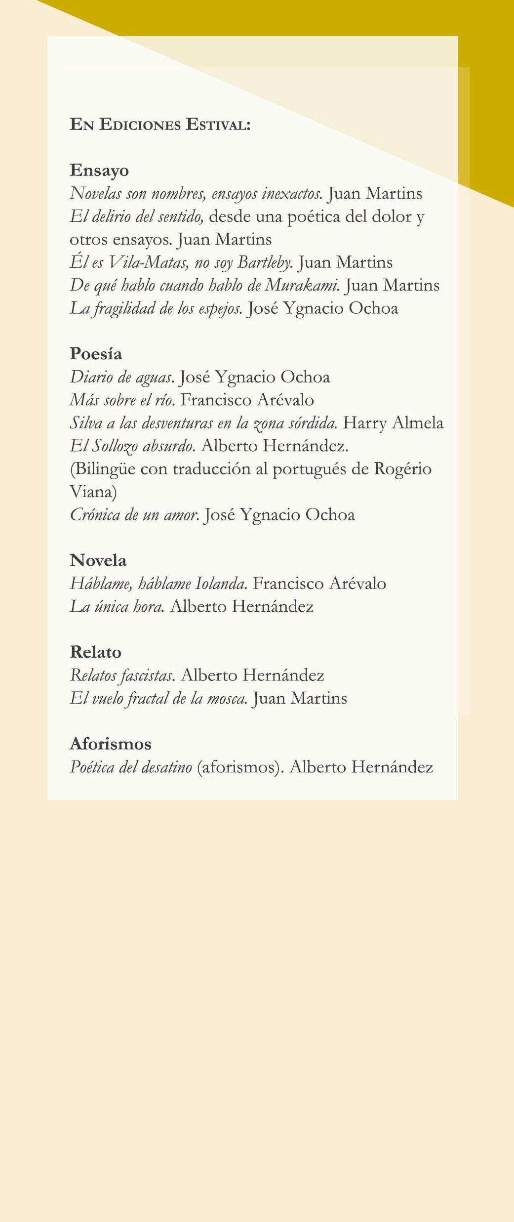 La celebración de Enriqueta Arvelo Larriva, 11 · Contra El muro: Notas sobre Fernando Paz Castillo, 17. · Rafael Cadenas: Música entregada en el desastre, 23. · Yolanda Pantin, otra Muerte de Narciso, 33. · El cisne de Eugenio Montejo, 43. · Edda Armas: Intimismo culturalista, 55. · Observaciones sobre Juan Sánchez Peláez, 67. · El celaje de lo ya sucedido en la poesía de Alejandro Oliveros, 75. · El cangrejo ermitaño de Arturo Gutiérrez Plaza, 81. · Ana Enriqueta Terán: visita a la Casa de hablas, 89. · Elizabeth Schön: Un mar imaginado, 99. · La imagen tangible de Teófilo Tortolero, 105. · Regresar al comienzo: Ana Nuño, la sextina y la tradición, 111. · Patria y prosodia: el país en un poema de Harry Almela, 119.