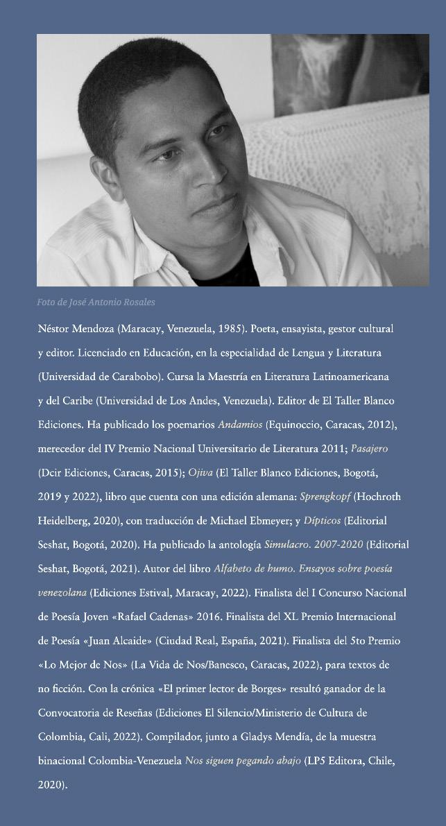 · Digresiones para Vitruvio / (O el ad quadratum), 19 · Una foto de Jesús Abab Colorado/ (Tributo a una imagen), 20 · Una estampa de neón, 22 · Escaparate, 23 · Identidad, 24 · Una esquina, 25 · Cosas dispersas, 26 · Una hoja, 28 · Una opinión sobre la belleza, 29 · Una mano durante la pesadilla, 30 · La distancia también es cuerpo/(Una imitación de Juarroz), 32 · Ejercicio con imágenes, 34 · Pañuelo en alto, 35 · Rectángulo de madera, 36 · El cuerpo como piedra, 37 · El sol también es objeto, 38 · Pie omitido, 39 · Cuerpo de mujer encima de la danta, 40 · Una estatuilla, la Venus de Tacarigua, 42 · Mascarón de proa, 43 · Máscara, 44 · Una pupa, 45 · Ave frente al espejo, 46 · Polilla blanca de la infancia, 47 · Pan paniscus, 49