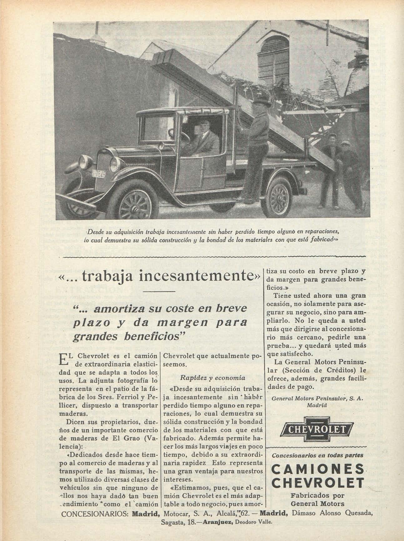 EL Chevrolet es el camión de extraordinaria elasticidad que se adapta a todos los usos. La adjunta fotografía lo representa en elpatio de la fábrica de los Sres. Ferrioly Pellicer, dispuesto a transportar maderas.