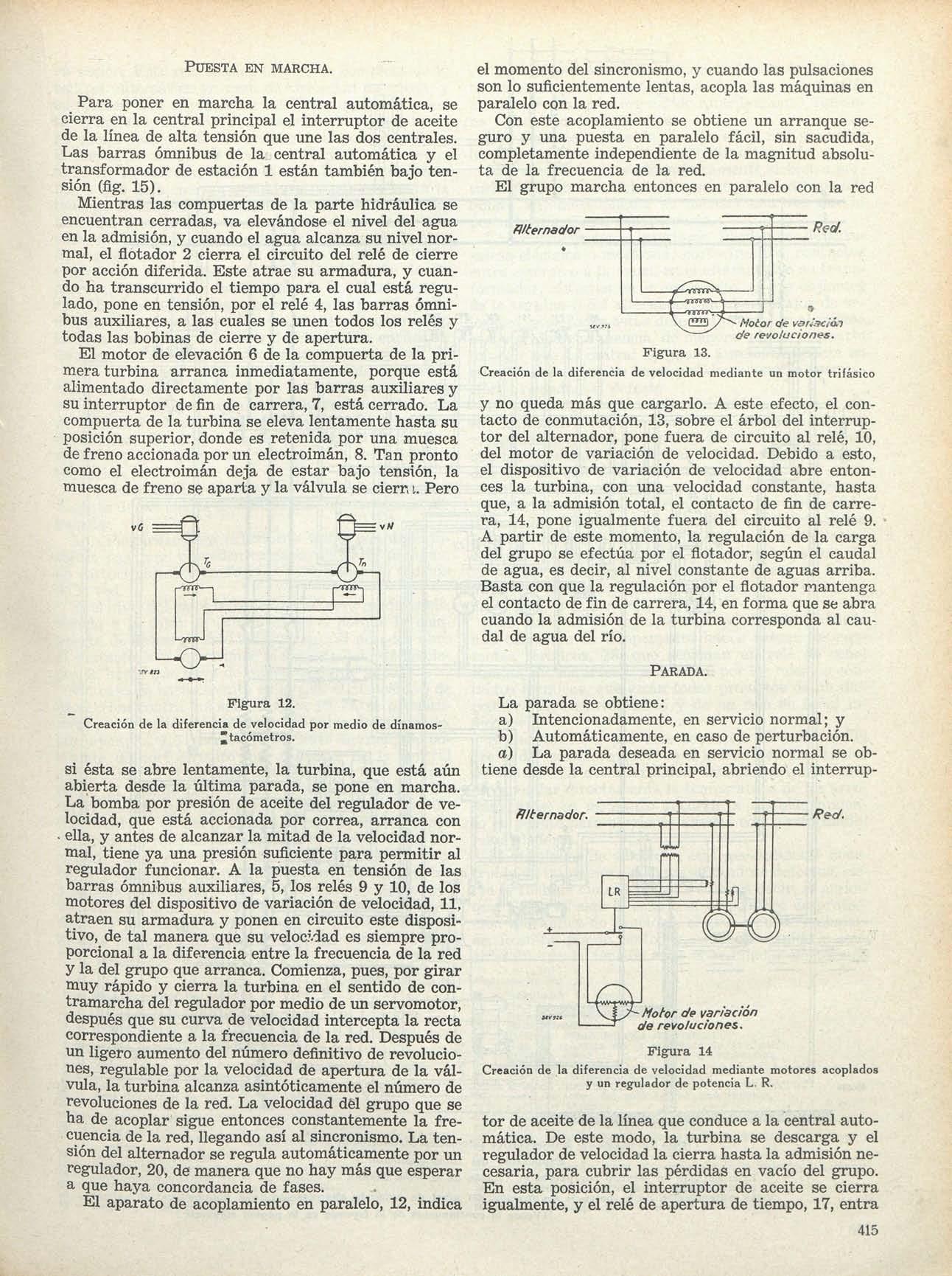 si ésta se abre lentamente, la turbina, que está aún abierta desde la última parada, se pone en marcha La bomba por presión de aceite delregulador de velocidad, que está accionada por correa, arranca con ella,yantesdealcanzarlamitad delavelocidad normal,tieneya una presión suficiente para permitir al regulador funcionar A la puesta en tensión de las barras ómnibus auxiliares, 5,losrelés 9y 10,de los motores deldispositivo devariación develocidad,11, atraen su armadura yponenencircuitoeste dispositivo,detal manera que su velocidad es siempre proporcional aladiferencia entrelafrecuencia dela red yladelgrupoquearranca Comienza,pues,por girar muy rápido y cierra laturbina en elsentido de contramarcha delreguladorpormediodeun servomotor, despuésquesucurva develocidadinterceptala recta correspondiente alafrecuencia delared Después de unligeroaumentodelnúmerodefinitivode revoluciones,regulable porlavelocidad deapertura dela válvula,laturbina alcanzaasintóticamente elnúmero de revoluciones delared La velocidad delgrupo que se ha de acoplar sigue entonces constantemente la frecuenciadelared,llegandoasíalsincronismo.La tensióndelalternadorseregulaautomáticamente por un regulador, 20,demanera quenohaymásque esperar a que haya concordancia de fases.