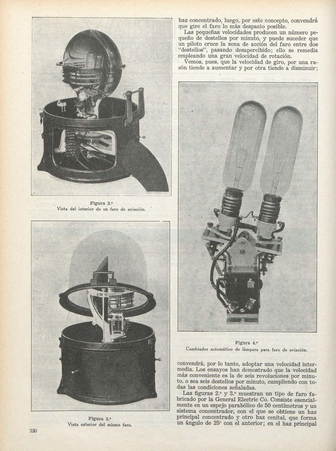 Las figuras 2."y 3." muestran tm tipo de faro fabricadoporlaGeneralElectricCo Consiste esencialmenteenunespejoparabólicode50centímetrosy un sistema concentrador, con el que se obtiene un haz principal concentrado y otro haz cenital, que forma un ángulode25°con elanterior^ enelhaz principal