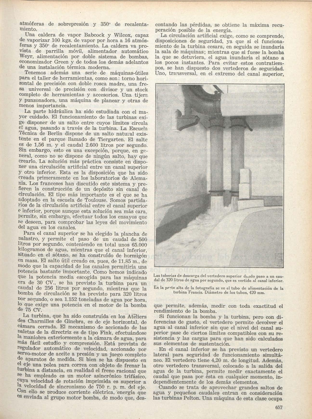La energía motriz de las máquinas ha de ser absorbida por máquinas operadoras E n muchos laboratorios modernos se prescinde de las transmisiones, prefiriéndose los acoplamientos directos entre unas máquinas y otras, empleándose en lo posible recuperaciones de energía. Una de las más prácticas es sin duda el suministro de alumbrado y fuerza para el propio edificio Todos estos principios se han tenido en cuenta en el Laboratorio de Hidráulica de la Escuela