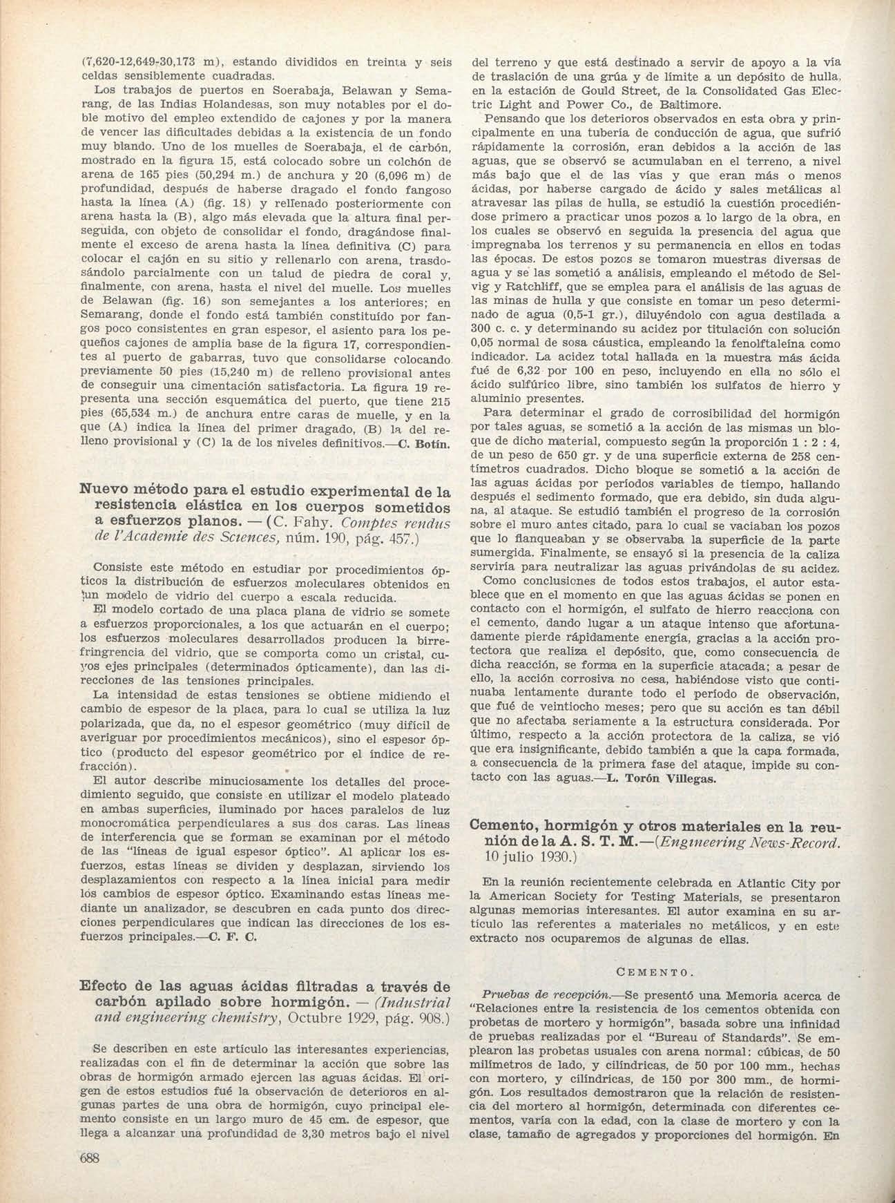 El capitulo IX ha sido notablemente reformado en vista de los últimos estudios del autor relativos a presas bóvedas Aparece, como en la primera edición, el metodo de Pigeaud para cálculo de presas de gravedad. Se hace la crítica, demostrando su absoluta inexactitud, del método de Stucky empleado para el cálculo de presas bóvedas, exponiendo elmétodo y sistema constructivo del autor, apareciendo los planos de la presa q^ueactualmente construye Aplica este mismo criterio para las presas de bóvedas y contrafuertes, resultando este capítulo muy interesante por su originalidad y valor doctrinal Creemos no esprecisohacer más elogios de la obra.—C F C