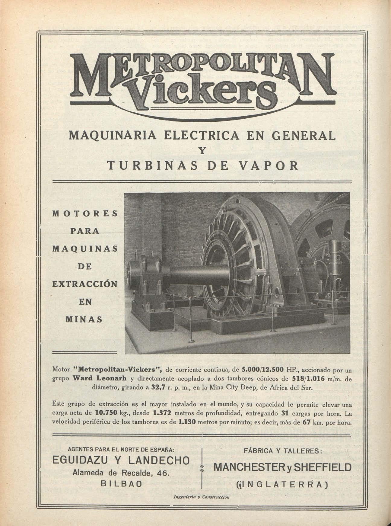 Motor "Metropolitan-Vickers", de corriente continua, de 5.000/12.500 HP., accionado por un grupo Ward Leonarh y directamente acoplado a dos tambores cónicos de 518/1.016 m/m. de diámetro, girando a 32,7 r. p. m., en la Mina City Deep, de África del Sur.