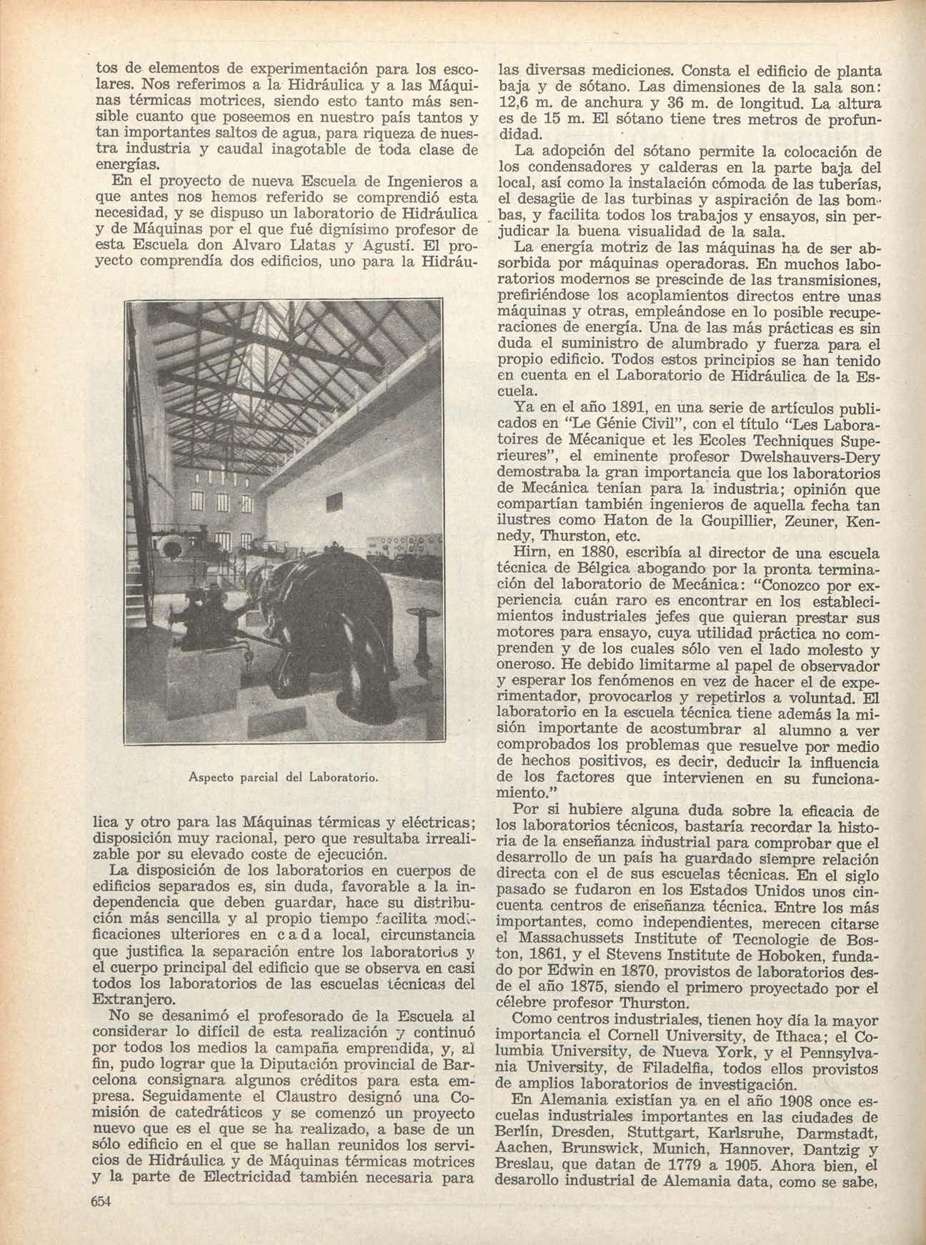 Por si hubiere alguna duda sobre la eficacia de los laboratorios técnicos, bastaría recordar la historia de la enseñanza industrial para comprobar que el desarrollo de un país ha guardado siempre relación directa con el de sus escuelas técnicas E n el siglo pasado se fudaron en los Estados Unidos unos cincuenta centros de enseñanza técnica Entre los más importantes, como independientes, merecen citarse el Massachussets Institute of Tecnologie de Boston, 1861, y el Stevens Institute de Hoboken, fundado por Edwin en 1870, provistos de laboratorios desde el año 1875, siendo el primero proyectado por el célebre profesor Thurston Como centros industriales, tienen hoy día la mayor importancia el Cornell University, de Ithaca; el Columbia University, de Nueva York, y el Pennsylvania University, de Filadelfia, todos ellos provistos de amplios laboratorios de investigación