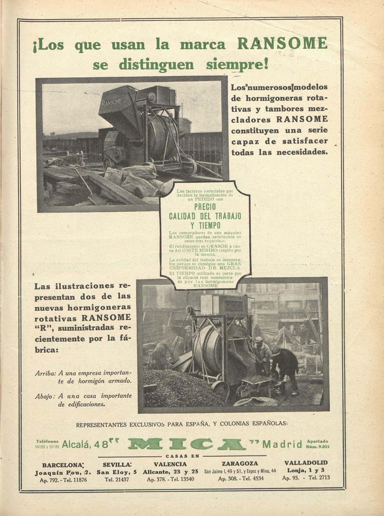 Los compradores de una máquina RANSOME quedan satisfeclios en estos tres requisitos El rendimiento es GRANDE a causa del COSTE MÍNIMO cxisido por la mezcla La calidad del trabajo es insuperable porque se consigue una GRAN UNIFORMIDAD D E MEZCLA El TIEMPO utilizado es corto por la eficacia real suministráis da por las hormigoneras m \ IMNSOME r
