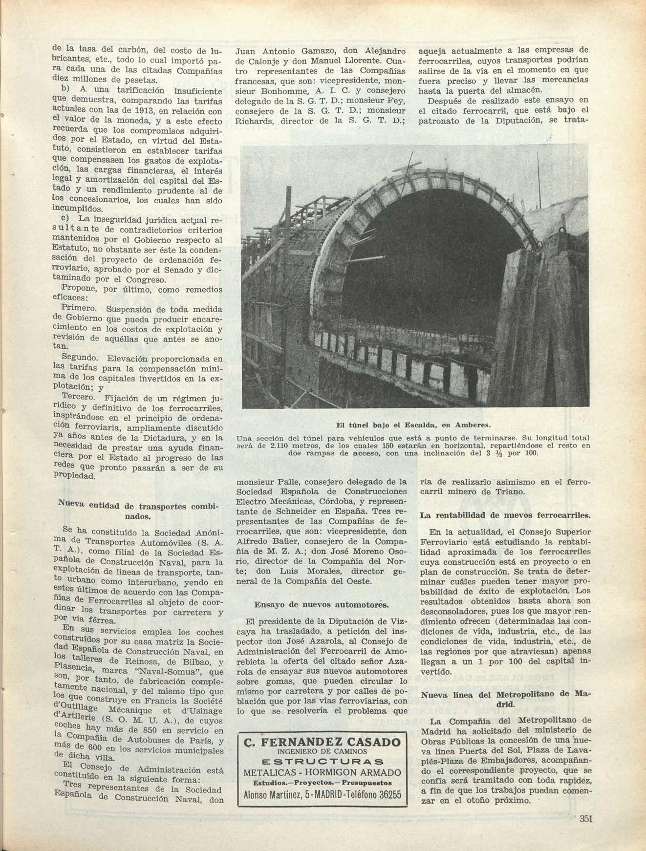 Tráfico 'probable.—Se hanobtenido para el tráfico cifras comprendidas entre 1.600coches diversos en días festivos a400entre semana. Tomaremosuna media diaria de 700 vehículos, que representan 255.500 carruajes al año.Aun estando acorde esta media obtenida cabe pensar: ¿Utilizarán lapistatodos losvehículos? Existe unafuerte razón económica para suponerlo. Lostécnicos ylosconductoressaben bien cuan caro cuesta almotor elesfuerzo superior para, enunamisma distancia, subir 61m. más, y aunhaciendo caso omiso dela diferencia, siempre apreciable, enelconsumo degasolina y lubrificantes para llegar aunmismo punto conelesfuerzo menor, nos quedará comoprincipal fundamento elqueafecta a lavidaindustrial deloscoches, paralosqueelpeaje porla autopista representa unpequeño canon de seguro. Es apreciable también la facilidad decirculación, que,aminorando otra clase deriesgo—pese al pequeño recorrido—, alnoencontrar eneste camino vehículos desangre, bicicletas ni peatones, da lugar a unaumento develocidad real y comercial.