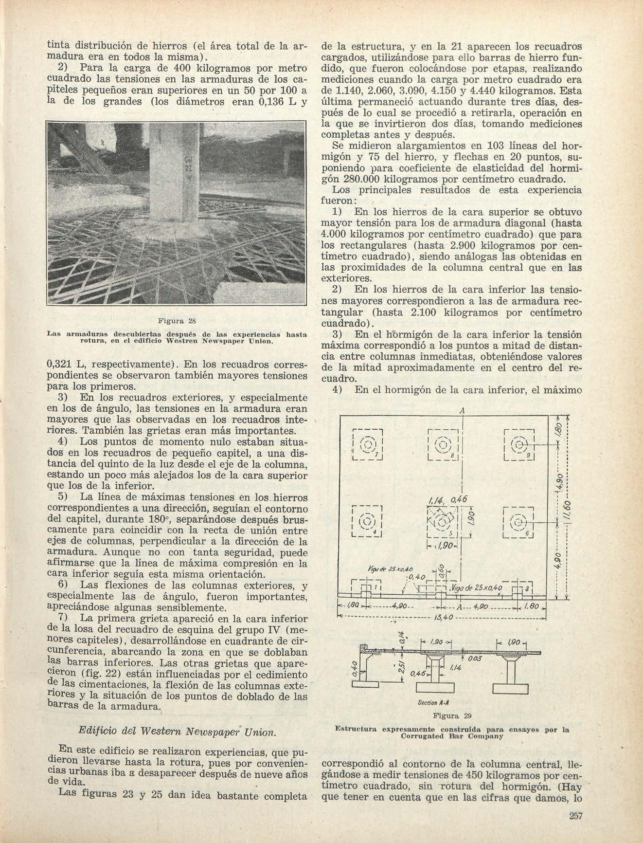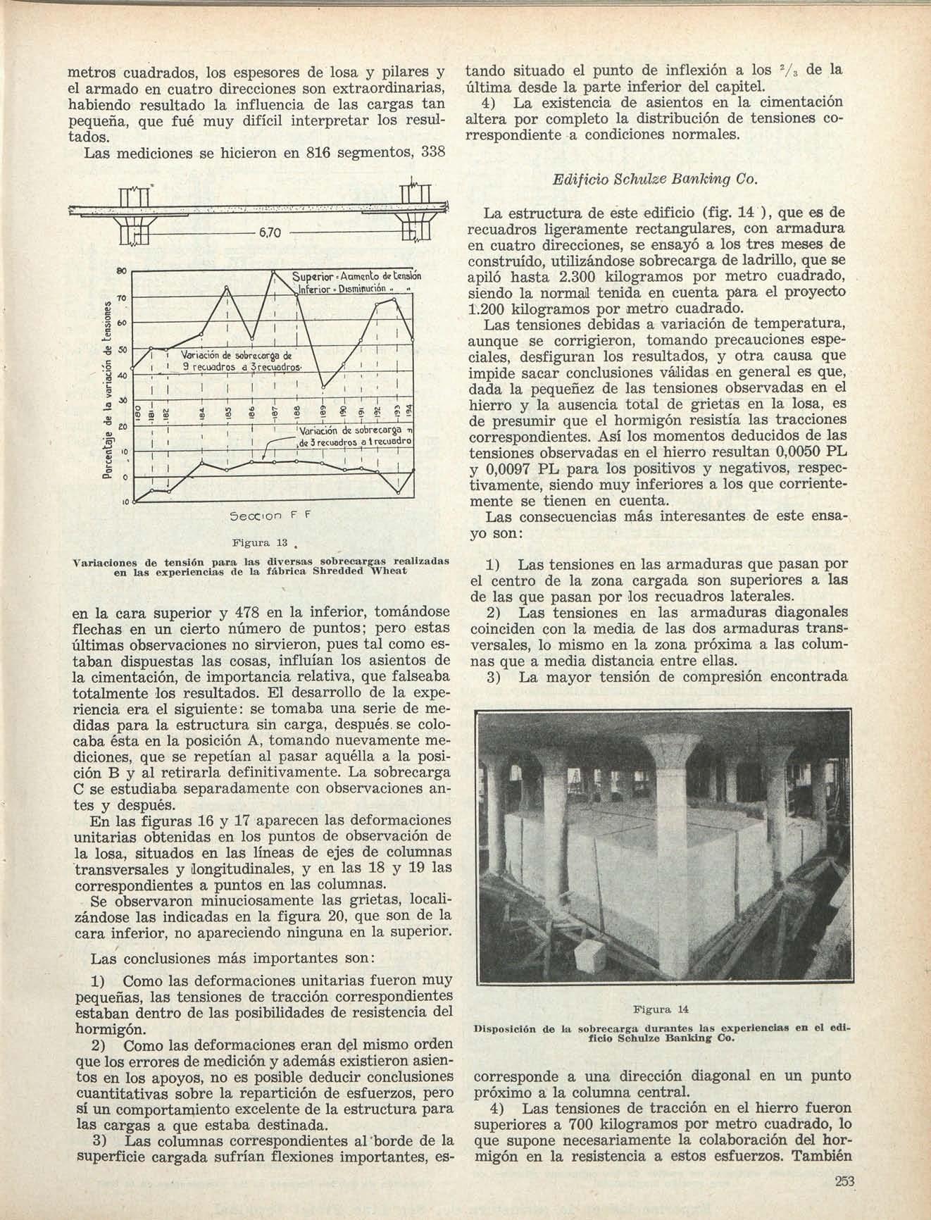 La estructura deeste edificio (fig 14),queesde recuadros ligeramente rectangulares, con armadura en cuatro direcciones, seensayó a lostres meses de construido, utilizándose sobrecarga deladrillo,quese apiló hasta 2.300 kilogramos por metro cuadrado, siendo la normal tenida en cuenta para el proyecto 1.200 kilogramos pormetro cuadrado