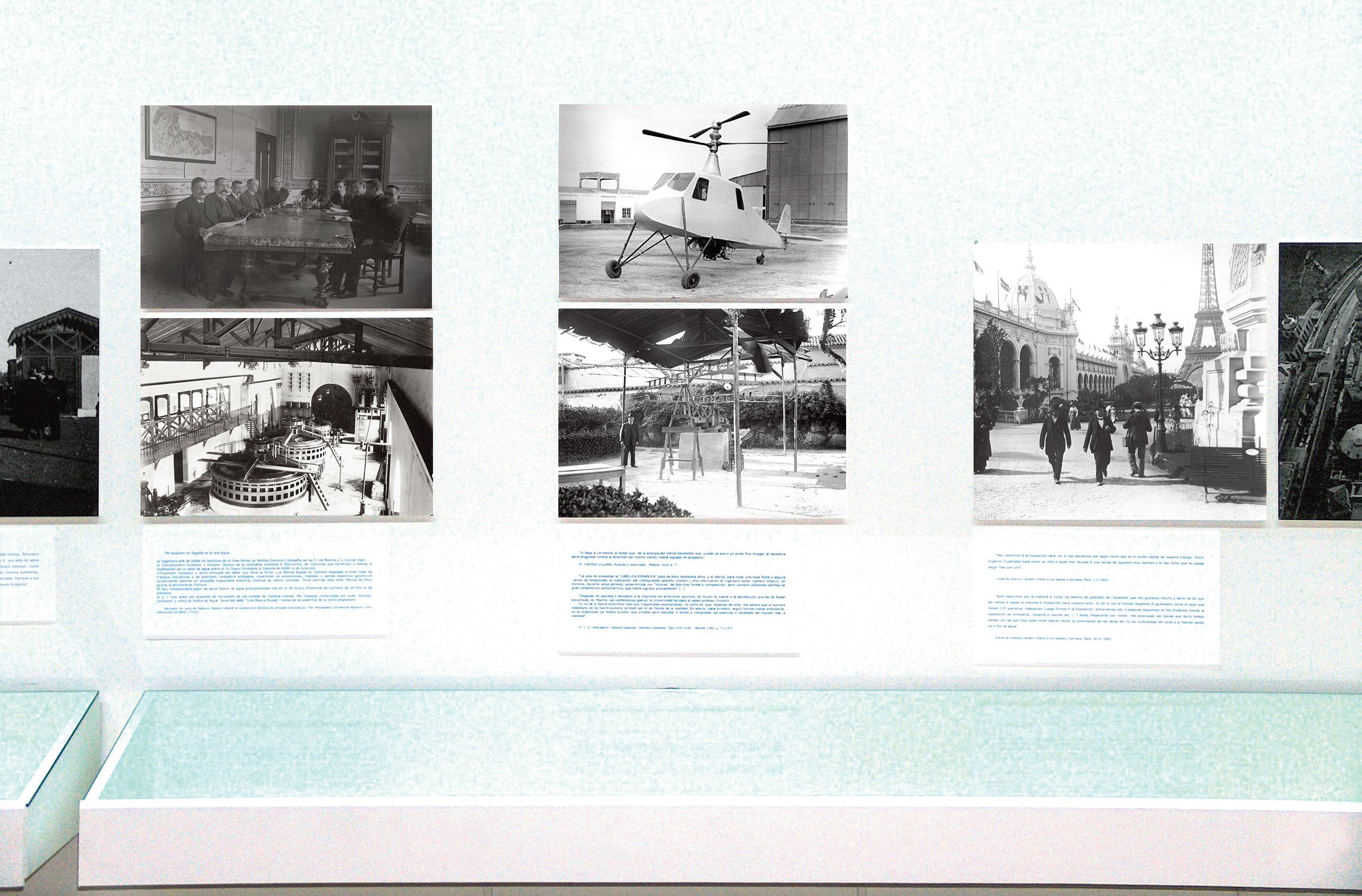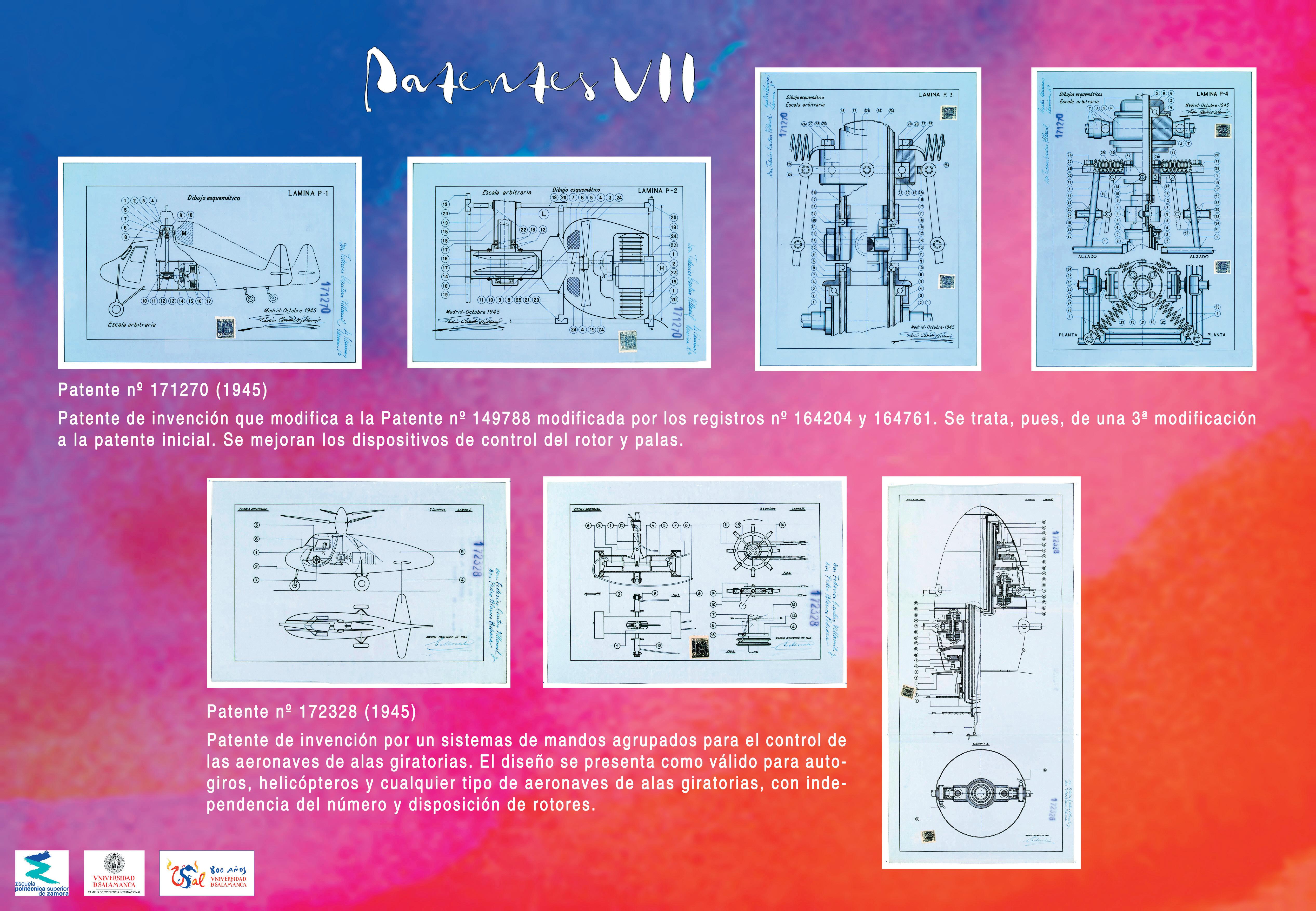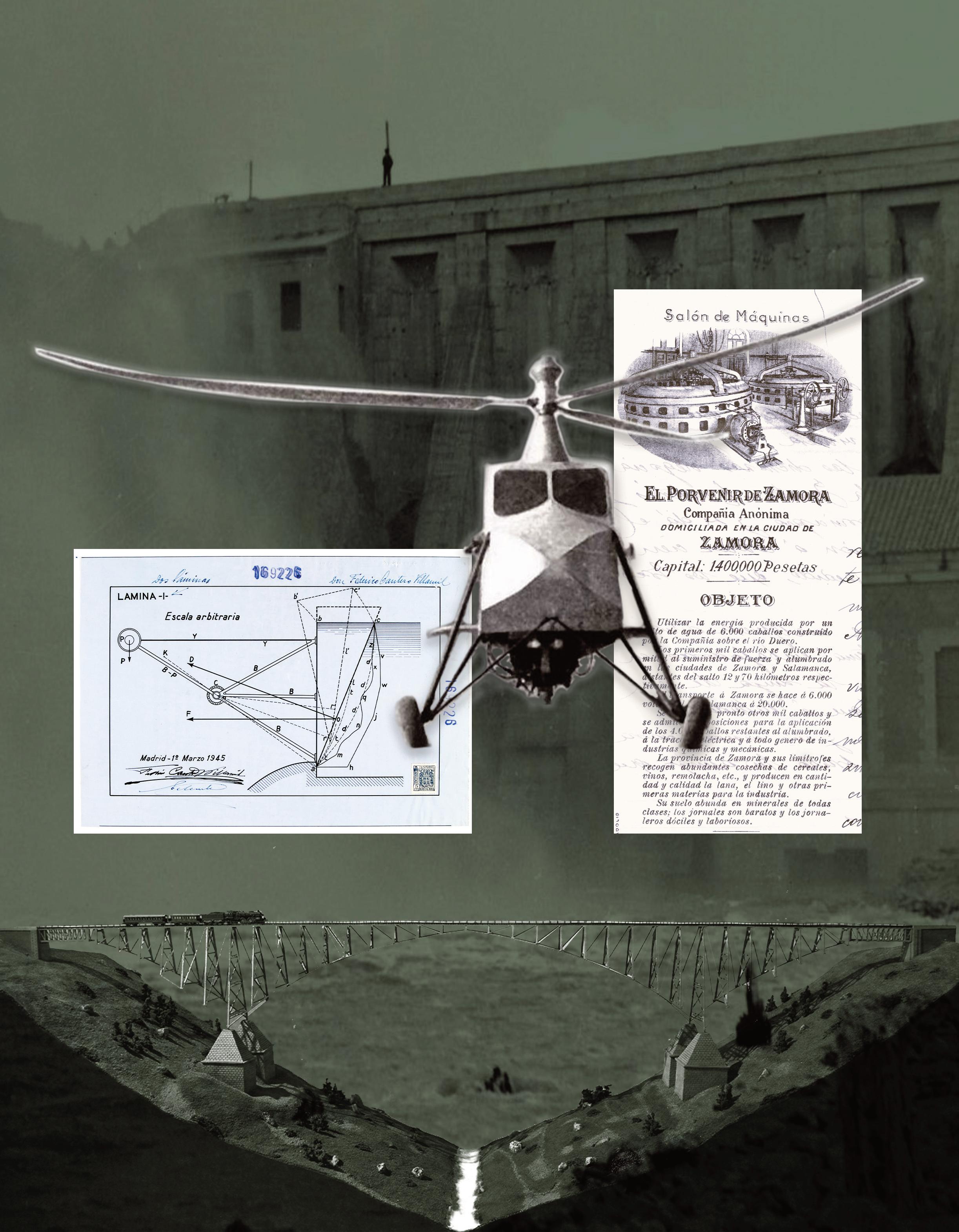 Embalse de Burgomillodo (Segovia), 1928; Patente de invención n.o 169226: Compuertas hidráulicas accionables sin necesidad de energía, 1945; Prototipo de helicóptero La Libélula Española, 1943; Anagrama de la empresa