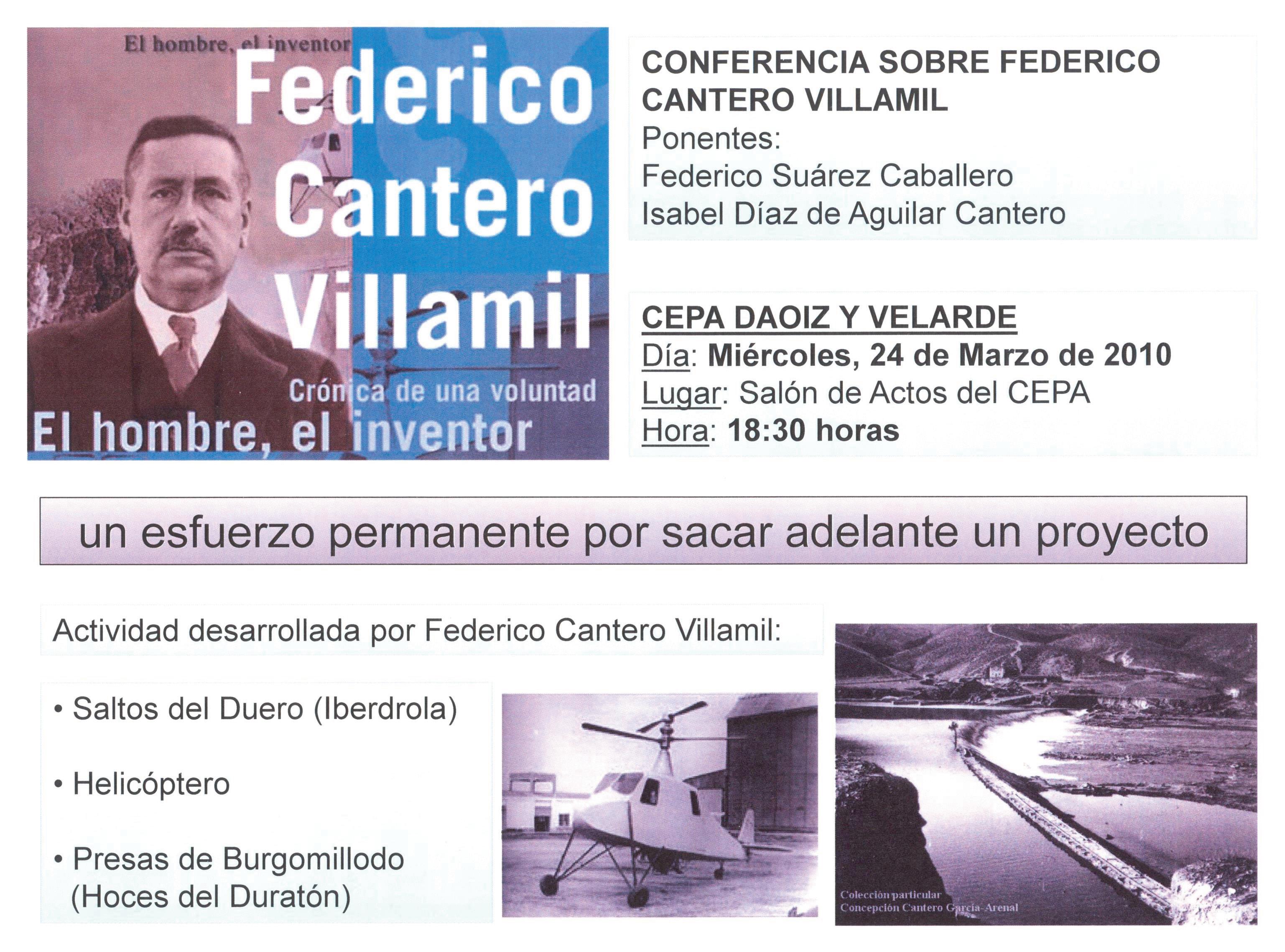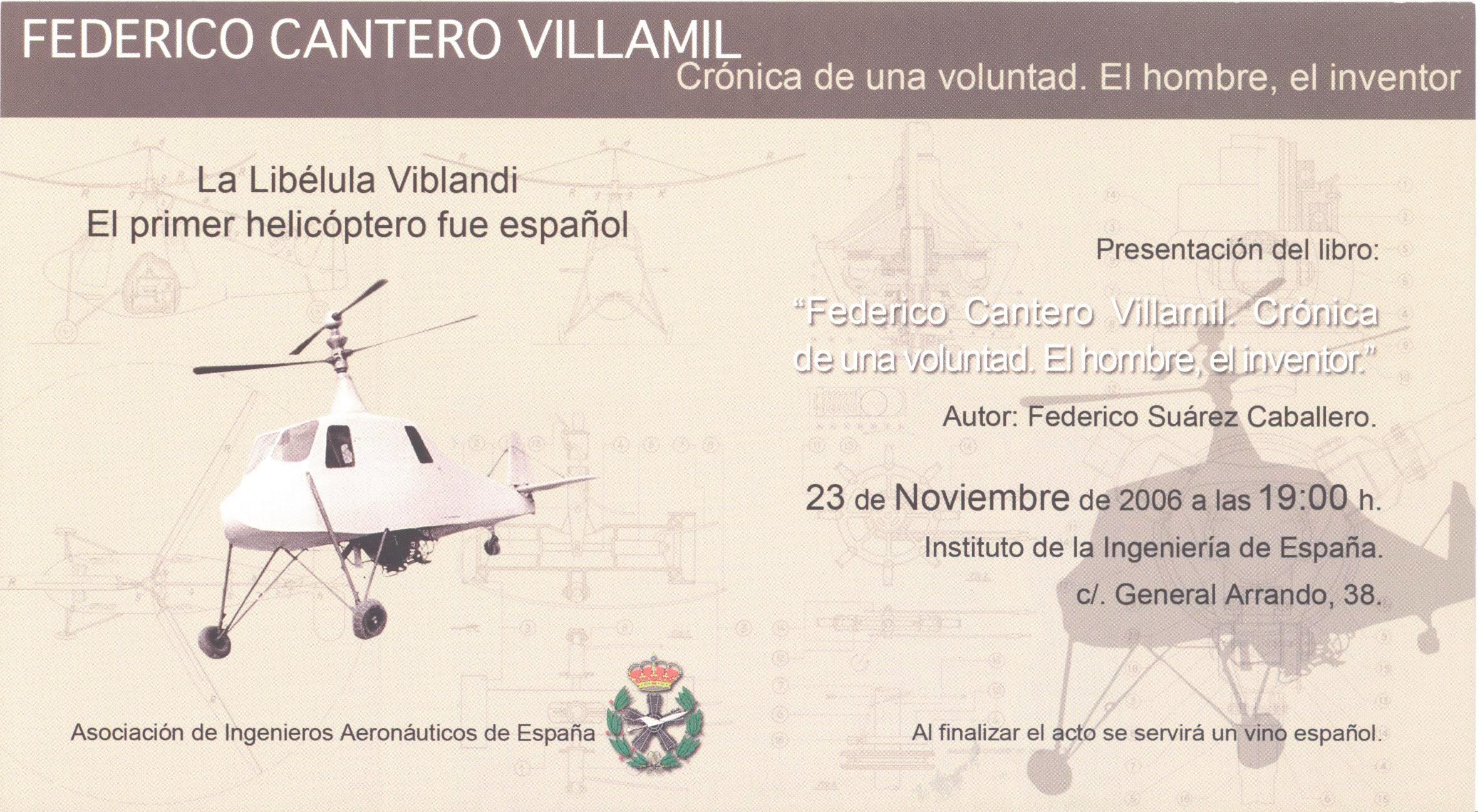 Yo había propuesto el nombre de Federico Cantero, cuya minibiografía, de medio folio, se me encargó. Lo cierto es que lo que en aquel momento sabía sobre su figura era poco más que lo consignado en el libro Saltos de agua y presas de embalse, en el que José Luis Gómez Navarro se refería a las presas de contrafuertes “tipo Cantero”. Solo al aparecer, en 2006, la extraordinaria biografía Federico Cantero Villamil (1874-1947) Crónica de una voluntad. El hombre. El inventor, escrita por Federico Suárez Caballero, supe de sus trabajos aeronáuticos. Envié a la Academia un párrafo adicional, que me aceptaron, y así quedó mí, a todas luces, insuficiente aportación.