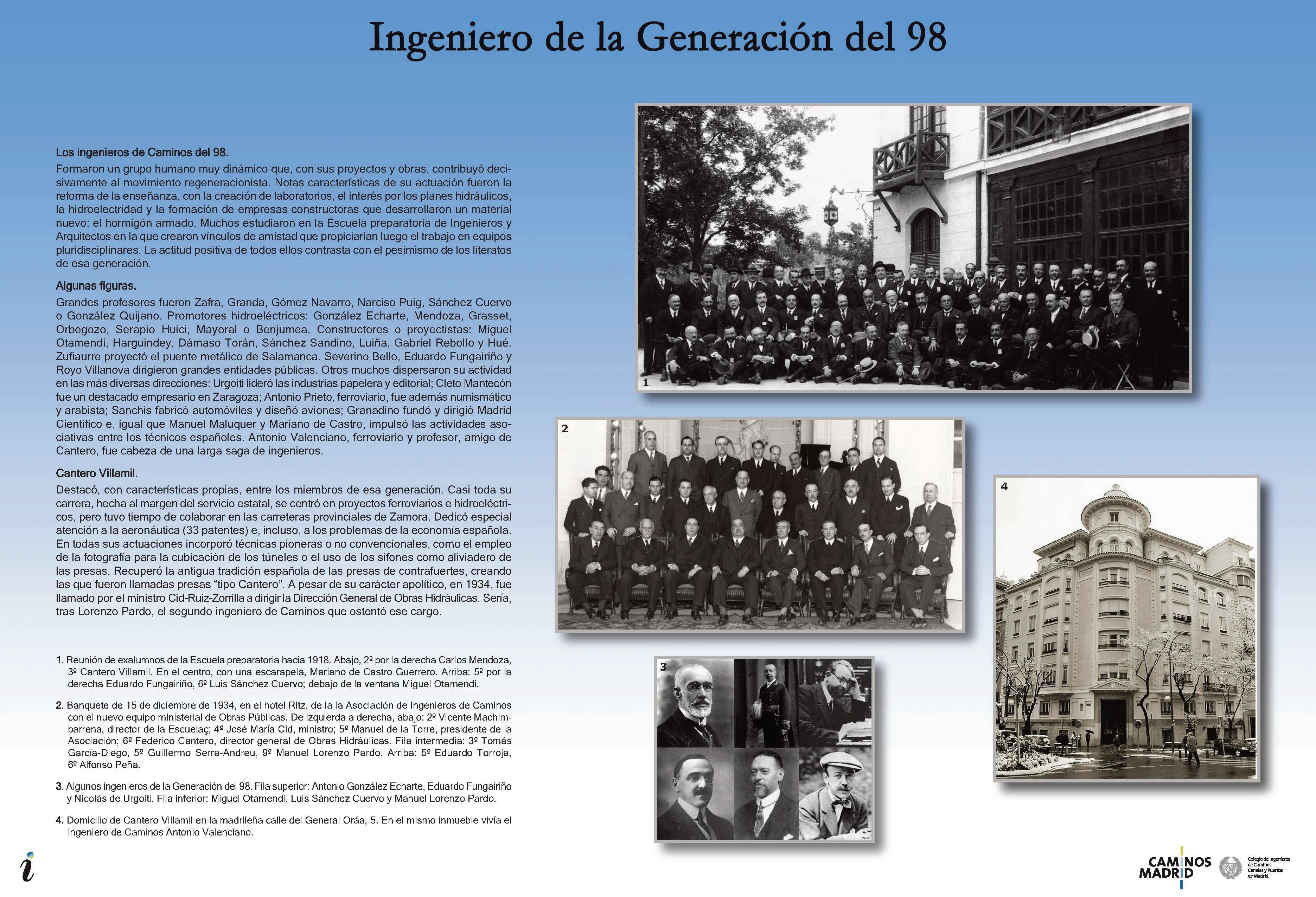 Federico Cantero Villamil es uno de los ingenieros más destacados de la que en otros sitios he denominado “generación del 98 de la ingeniería”. Esos ingenieros, de distintas especialidades, se incorporaron a la vida profesional y al mercado de trabajo algo antes o inmediatamente después de la pérdida de las últimas colonias. Sus promociones, más numerosas que las anteriores, no tuvieron acceso inmediato a los escalafones estatales por lo que debieron trabajar como profesionales libres. Muchos de ellos habían coincidido en la Escuela Preparatoria para Ingenieros y Arquitectos, en la que trabaron vínculos de amistad que propiciarían la creación de equipos pluridisciplinares. Entre sus dedicaciones preferentes destacan los desarrollos hidráulicos e hidroeléctricos y la utilización de un material nuevo: el hormigón armado. Promovieron, además, la reforma de la enseñanza.