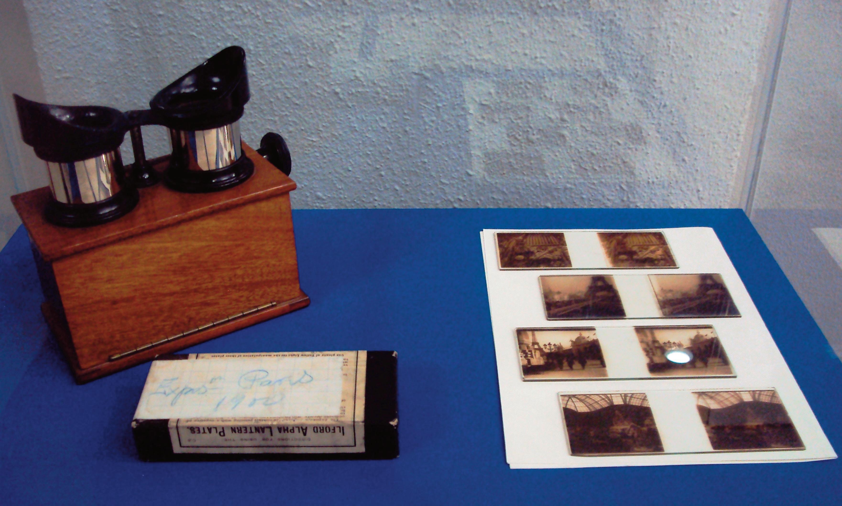 Foto 25: Visor estereoscópico de madera para cristales Verascope Richard (C.19) que utilizaba Federico Cantero Villamil. A la derecha, negativos estereoscópicos sobre cristal de algunas de las fotografías que hizo durante su estancia en la Exposición Universal de París de 1900 6