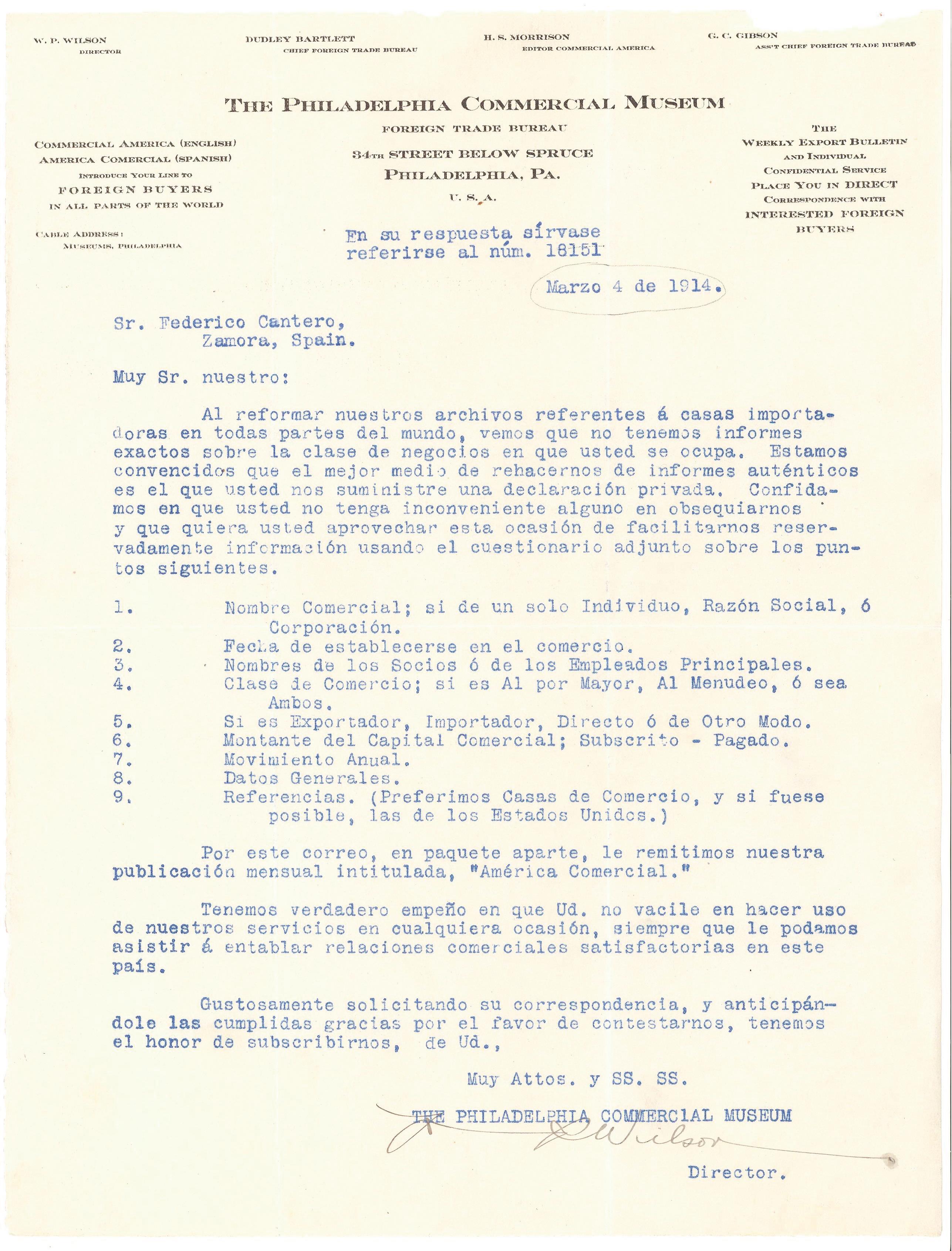 Foto 2: Petición de The Philadelphia Commercial Museum, adjunta a la carta dirigida por el Museo a Federico Cantero Villamil, con fecha de marzo de 191, en la que se le solicitan datos para actualizar sus archivos referentes a empresas importantes, en todo el mundo.
