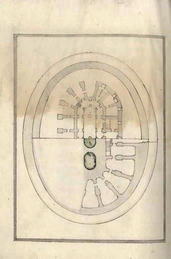 Propuesta de fortificación con planta ovalada . Dos discursos de Leonardo Turriano el primero sobre el Fuerte de San Lourenço de Cabeça Ceca en la boca del Taxo el segundo sobre limpiar la barra del dicho río y otras diferentes . Biblioteca Nacional de Portugal, Ms. 12892, f.23v.