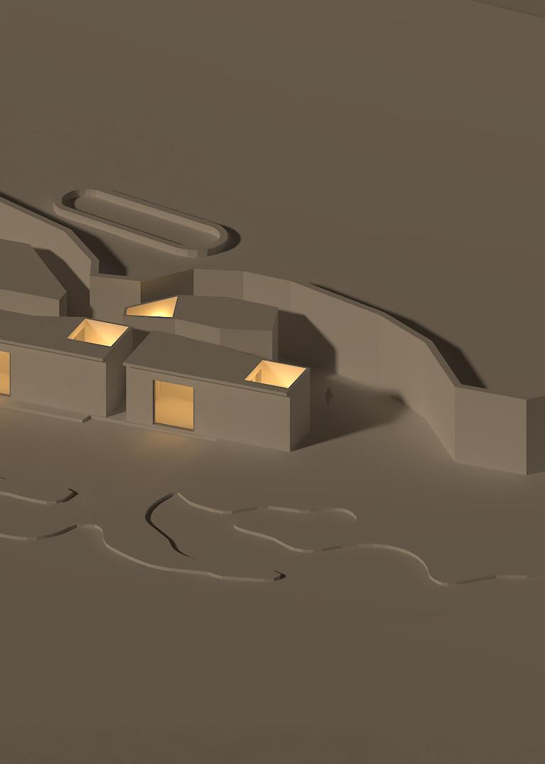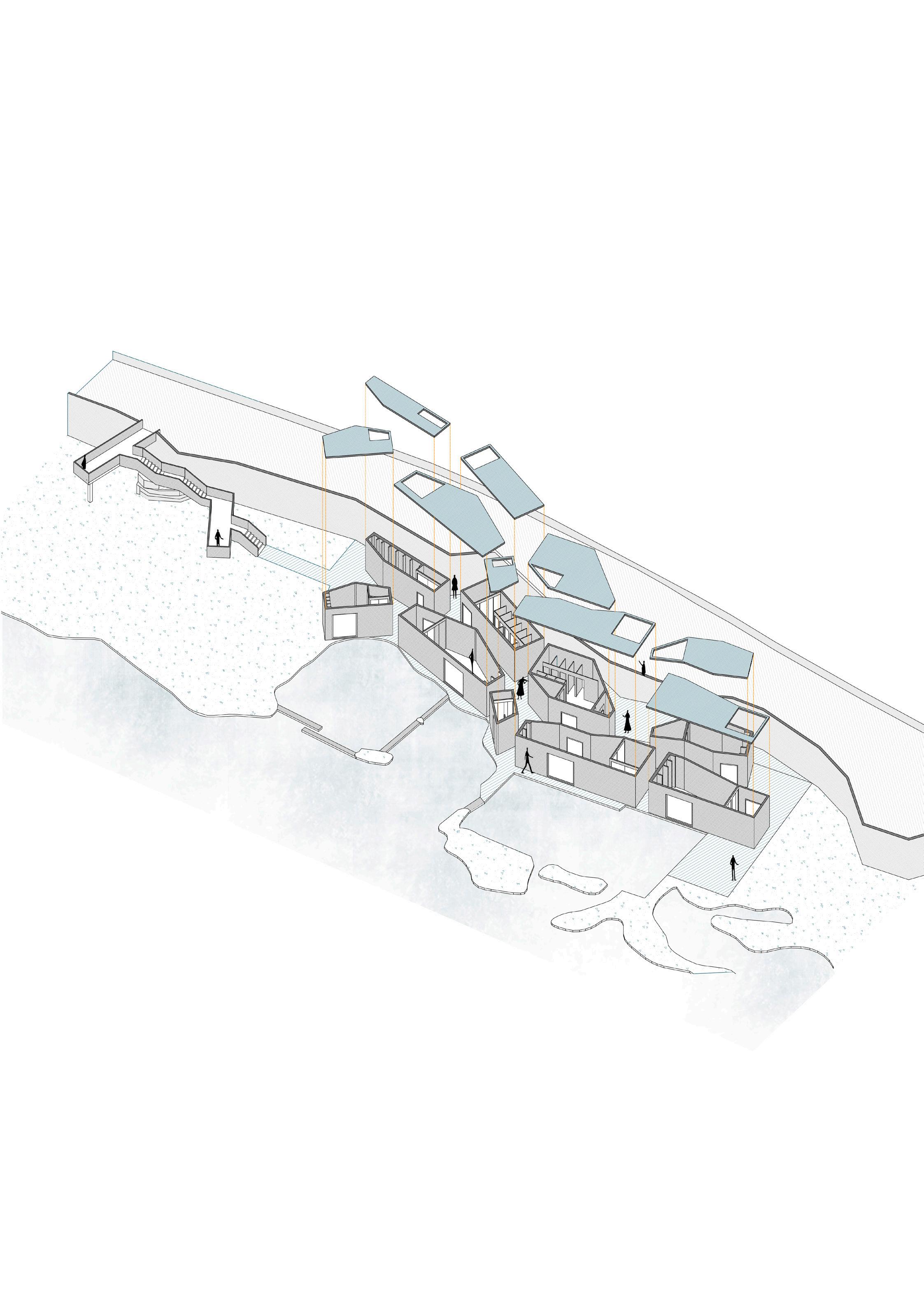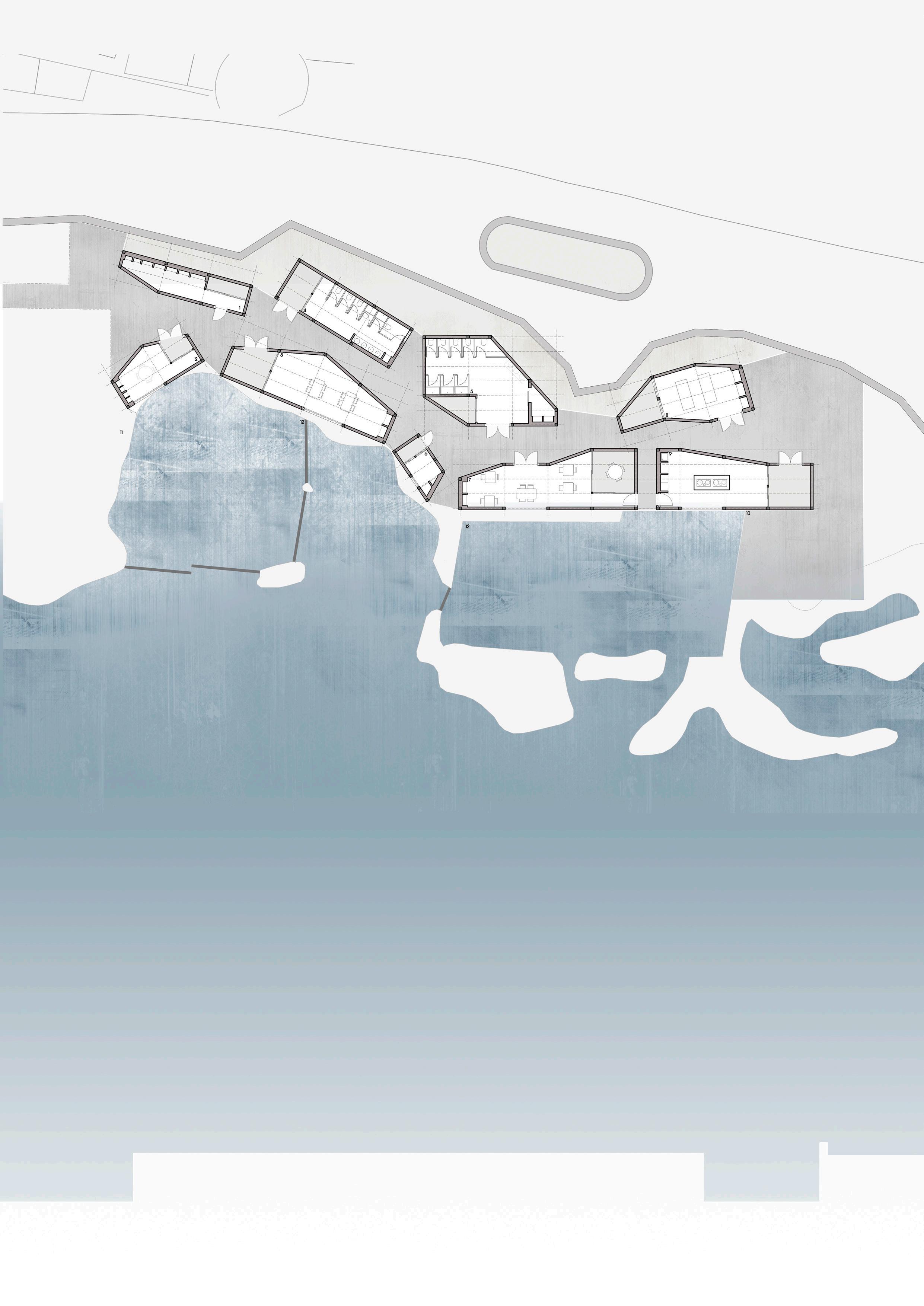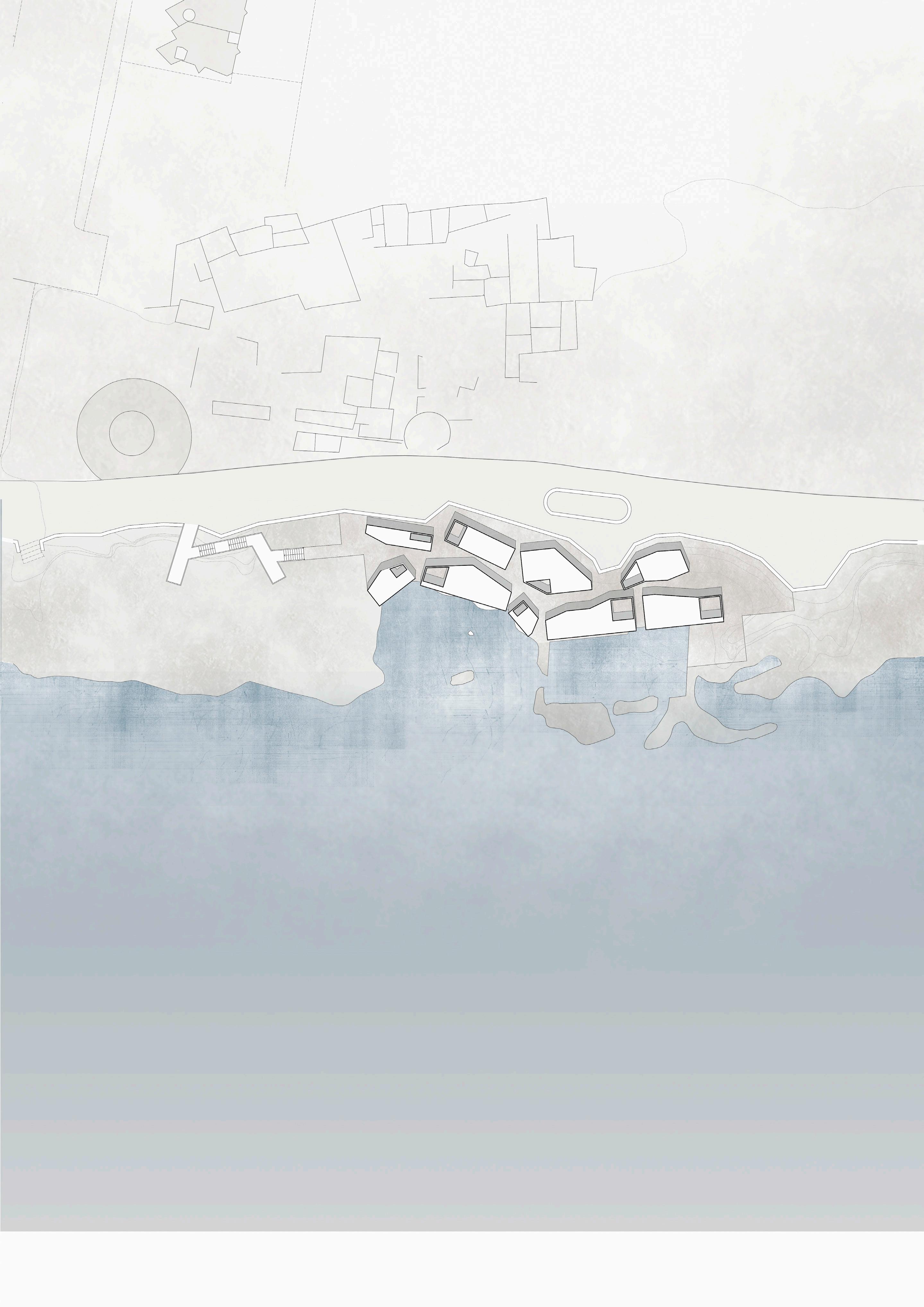El concepto es generar dos grietas, aprovechadas para crear los recorridos del proyecto, reforzando la línea de costa presente al lado sur y la medianera situada en el lado norte. Los volúmenes que albergan el programa del proyecto se separan entre sí para generar los puntos de conexión entre los recorridos y las entradas de luz a las grietas.