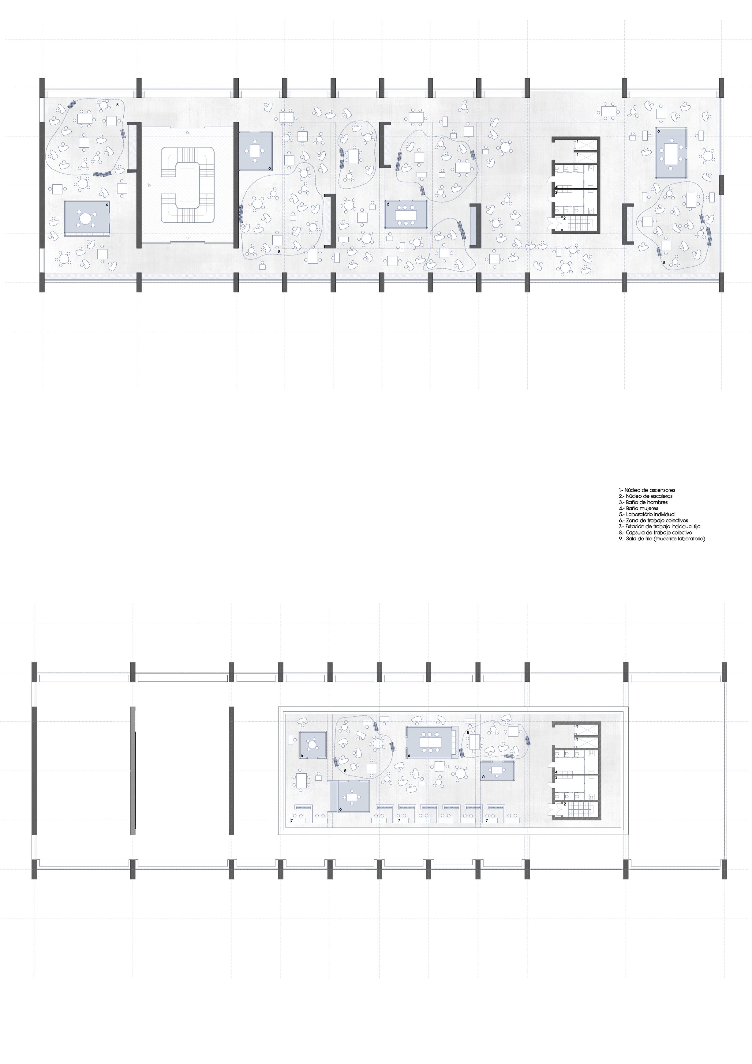 Zona de trabajo colectivos 7.- Estación de trabajo individual fija 8.- Cápsula de trabajo colectivo 9.- Sala de frío (muestras laboratorio)