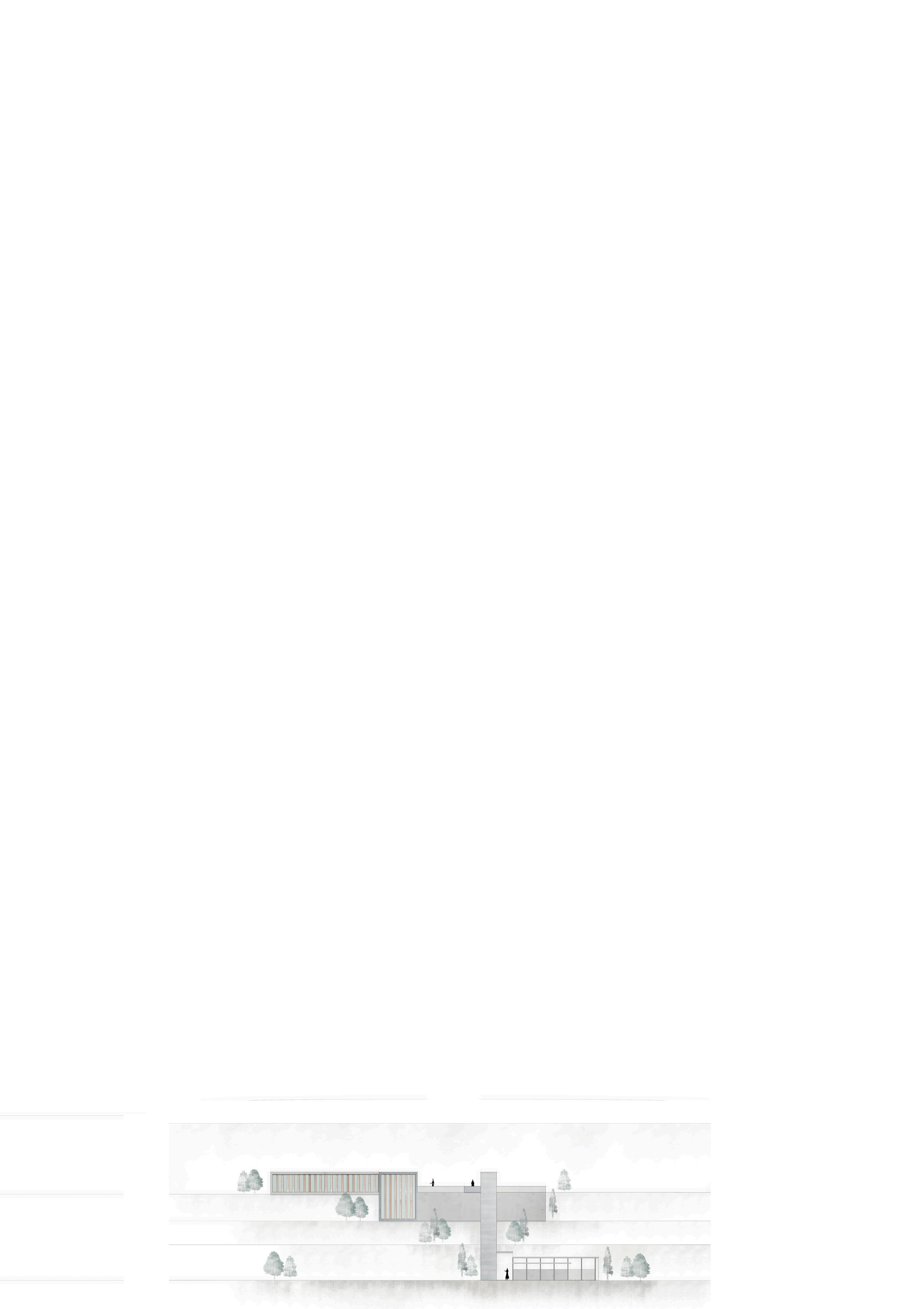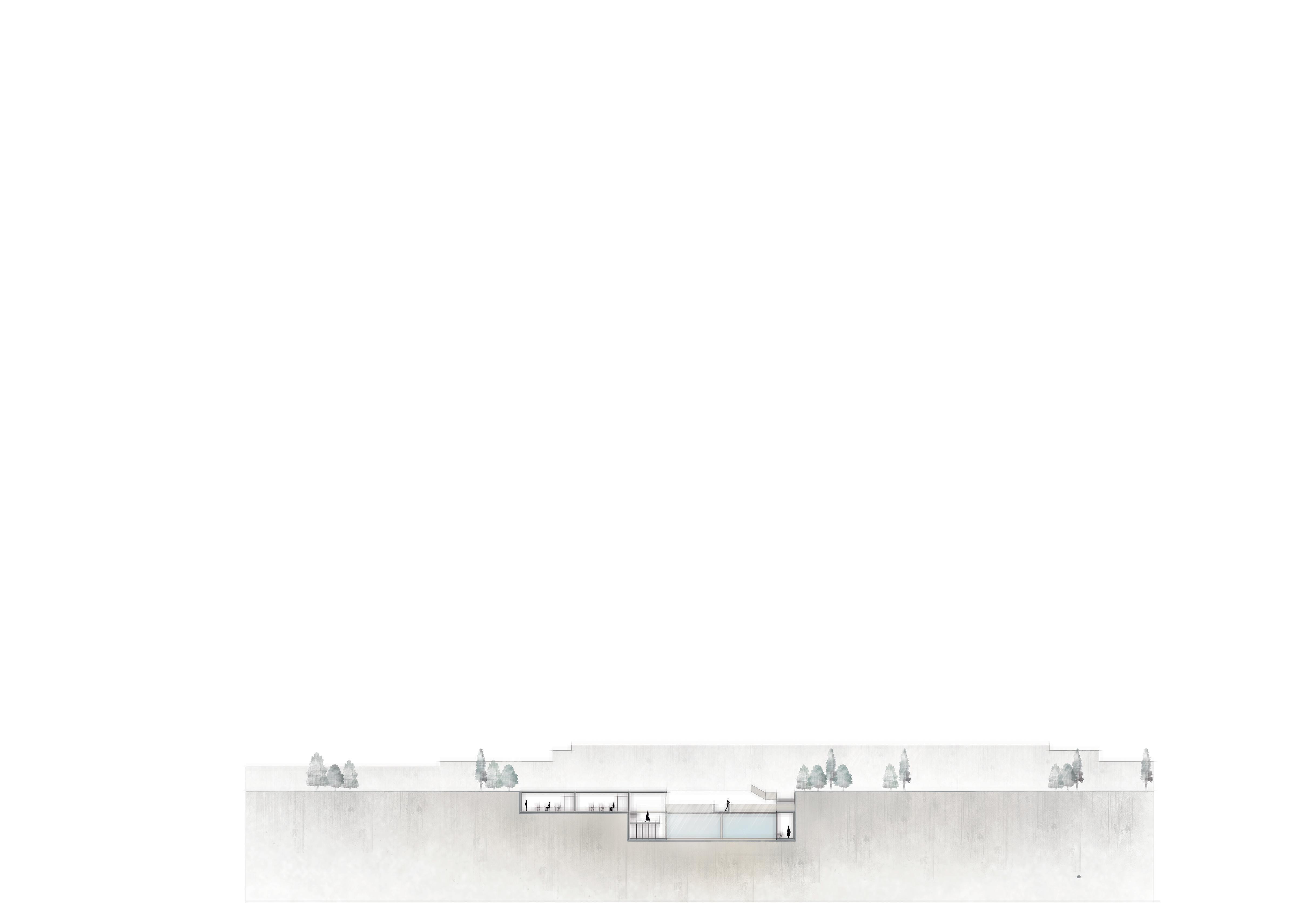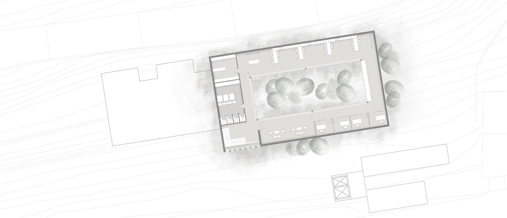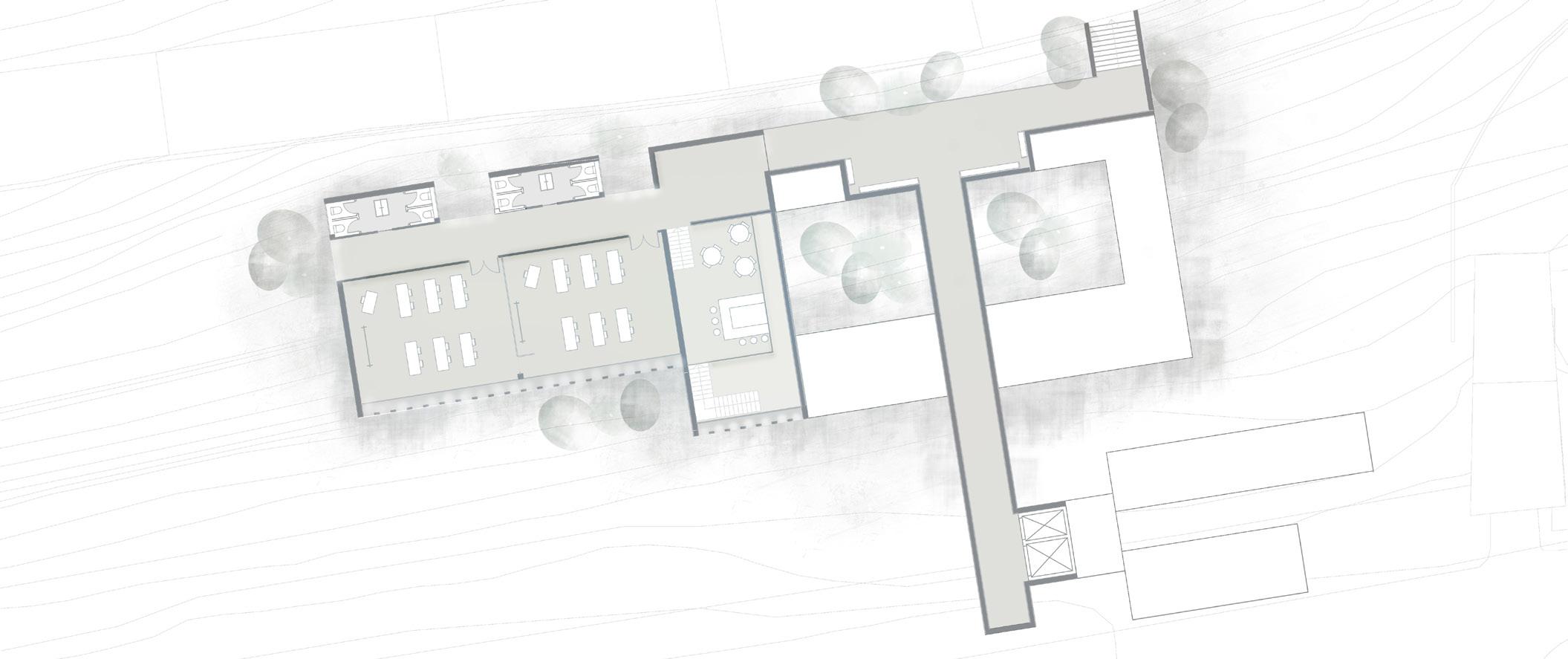 En la cota intermedia se ubica el laboratorio, estructurado en torno a un gran patio central donde emergen las copas de los árboles, integrando el paisaje en el interior.