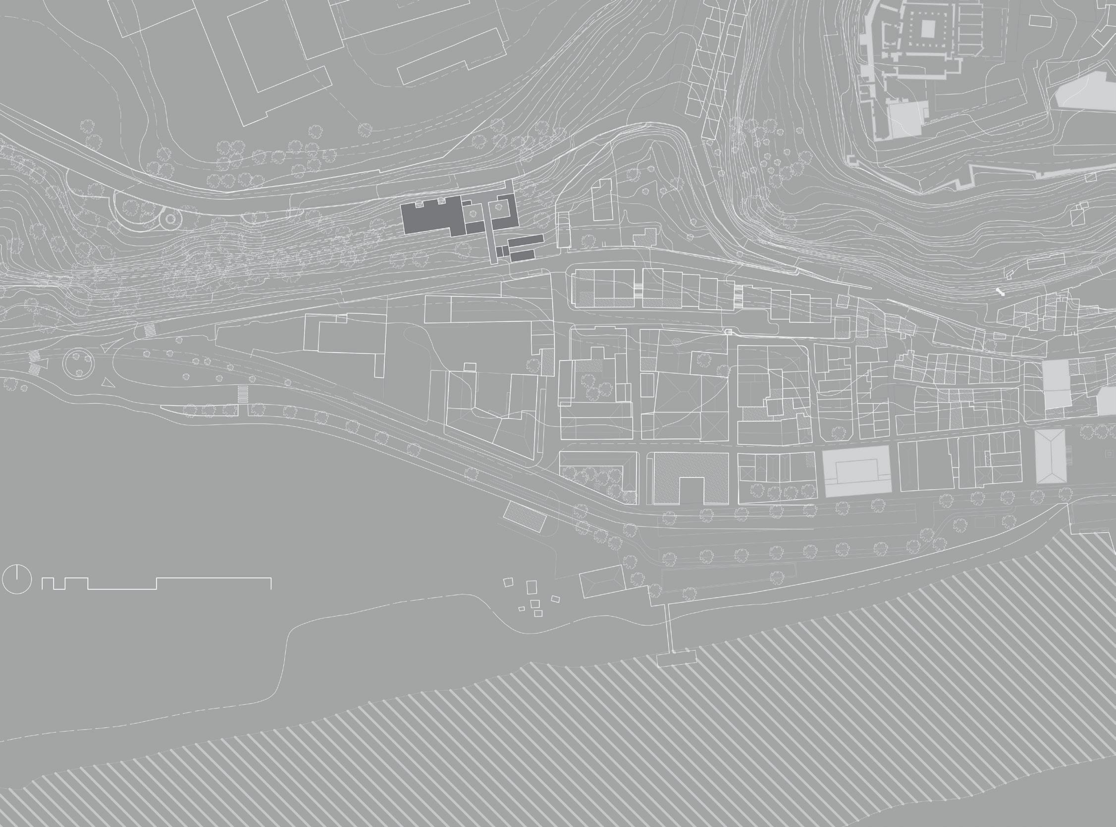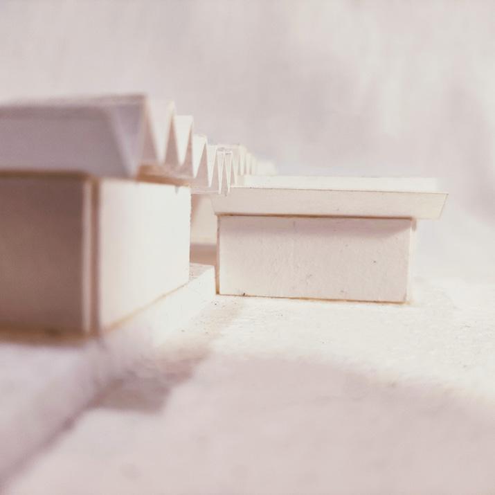 El primero más alargado y bajo, que alberga el programa administrativo, tiene una altura menor para mantener una cordial relación con la trama urbanística de Malpica.