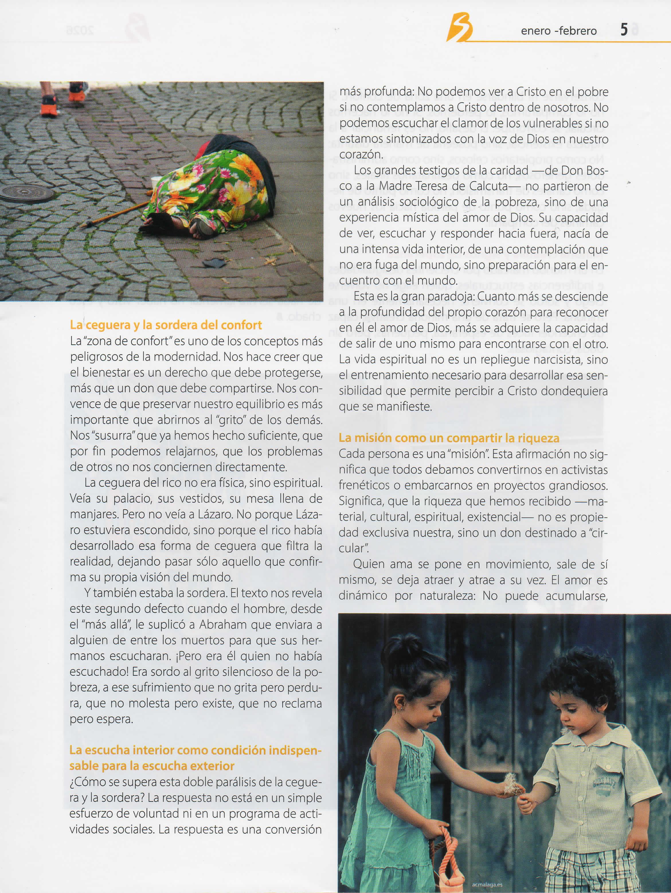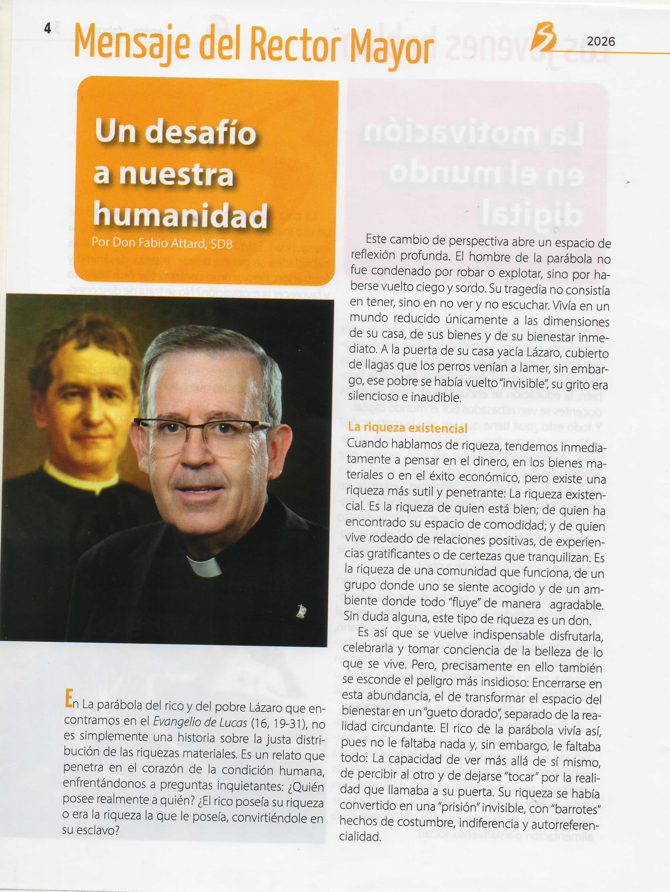 Cuando hablamos de riqueza, tendemos inmediatamente a pensar en el dinero, en los bienes materiales o en el éxito económico, pero existe una riqueza más sutil y penetrante: La riquezaexistencial Esla riqueza de quien está bien; de quien ha encontrado su espaciode comodidad; y de quien vive rodeado de relaciones positivas,de experiencias gratificantes o de certezas que tranquilizan Es la riqueza de una comunidad que funciona, de un grupo donde uno sesiente acogido y de un ambiente donde todo "fluye" de manera agradable Sin duda alguna, este tipo de riqueza esun don Es así que se vuelve indispensable disfrutarla, celebrarla y tomar conciencia de la belleza de lo que se vive Pero, precisamente en ello también se esconde el peligro más insidioso: Encerrarse en esta abundancia, el de transformarel espacio del bienestar en un"gueto dorado",separadode larealidad circundante. El rico de la parábola vivía así, pues no le faltaba nada y, sin embargo, le faltaba todo: La capacidad de ver más allá de sí mismo, de percibir al otro y de dejarse"tocar" por la realidad que llamaba a su puerta Su riqueza se había convertido en una"prisión"invisible, con"barrotes" hechos de costumbre, indiferencia y autorreferencialidad