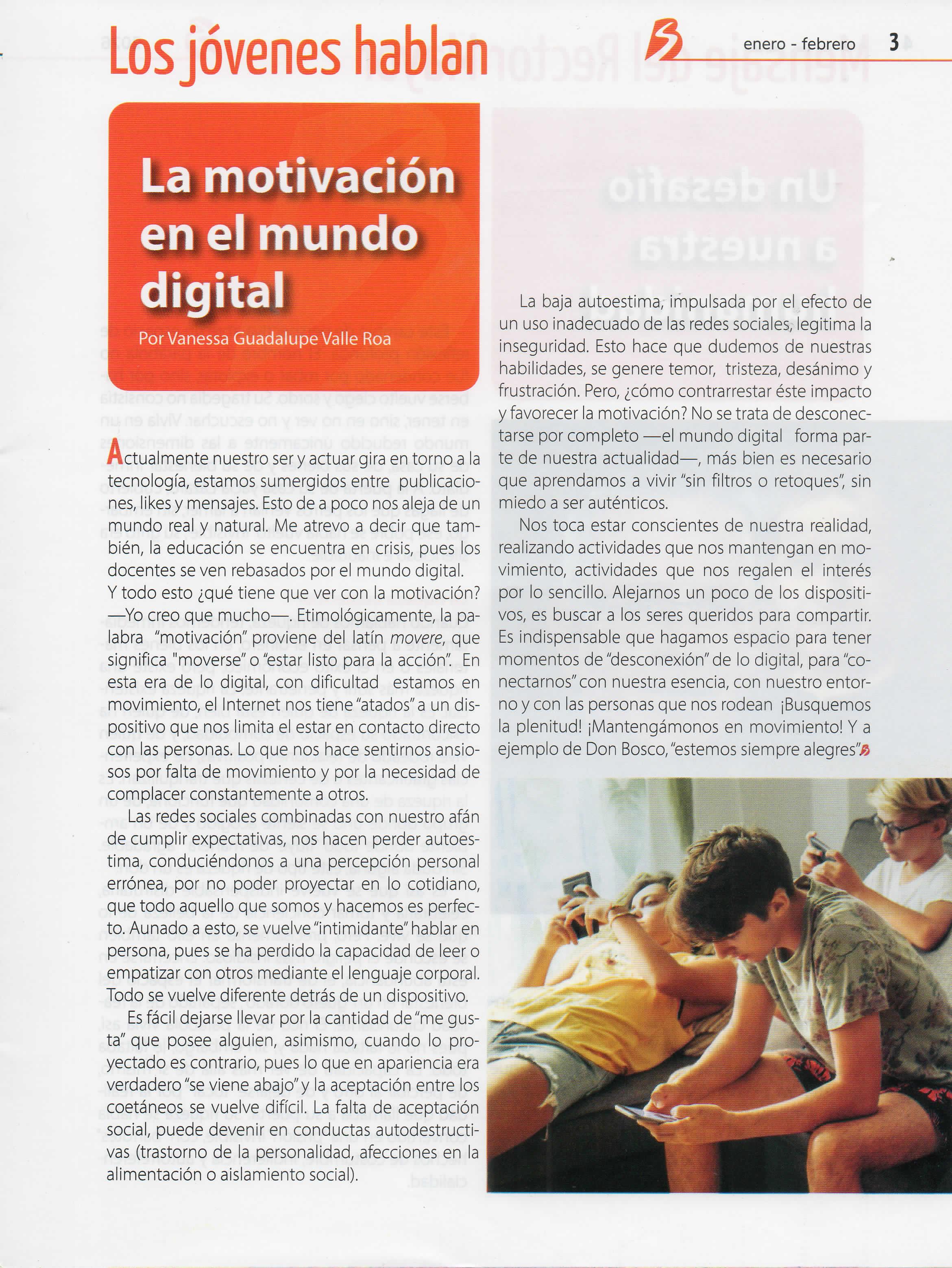 Nos toca estar conscientes de nuestrarealidad, realizando actividades que nos mantengan en movimiento, actividades que nos regalen el interés por lo sencillo. Alejarnosun poco de los dispositivos, es buscar a los seres queridos para compartir Es indispensable que hagamos espacio para tener momentos de "desconexión" de lo digital, para "conectarnos"con nuestra esencia,con nuestro entorno y con laspersonasque nos rodean ¡Busquemos la plenitud! ¡Mantengámonos en movimiento! Ya ejemplo de Don Bosco,"estemos siempre alegres".®
