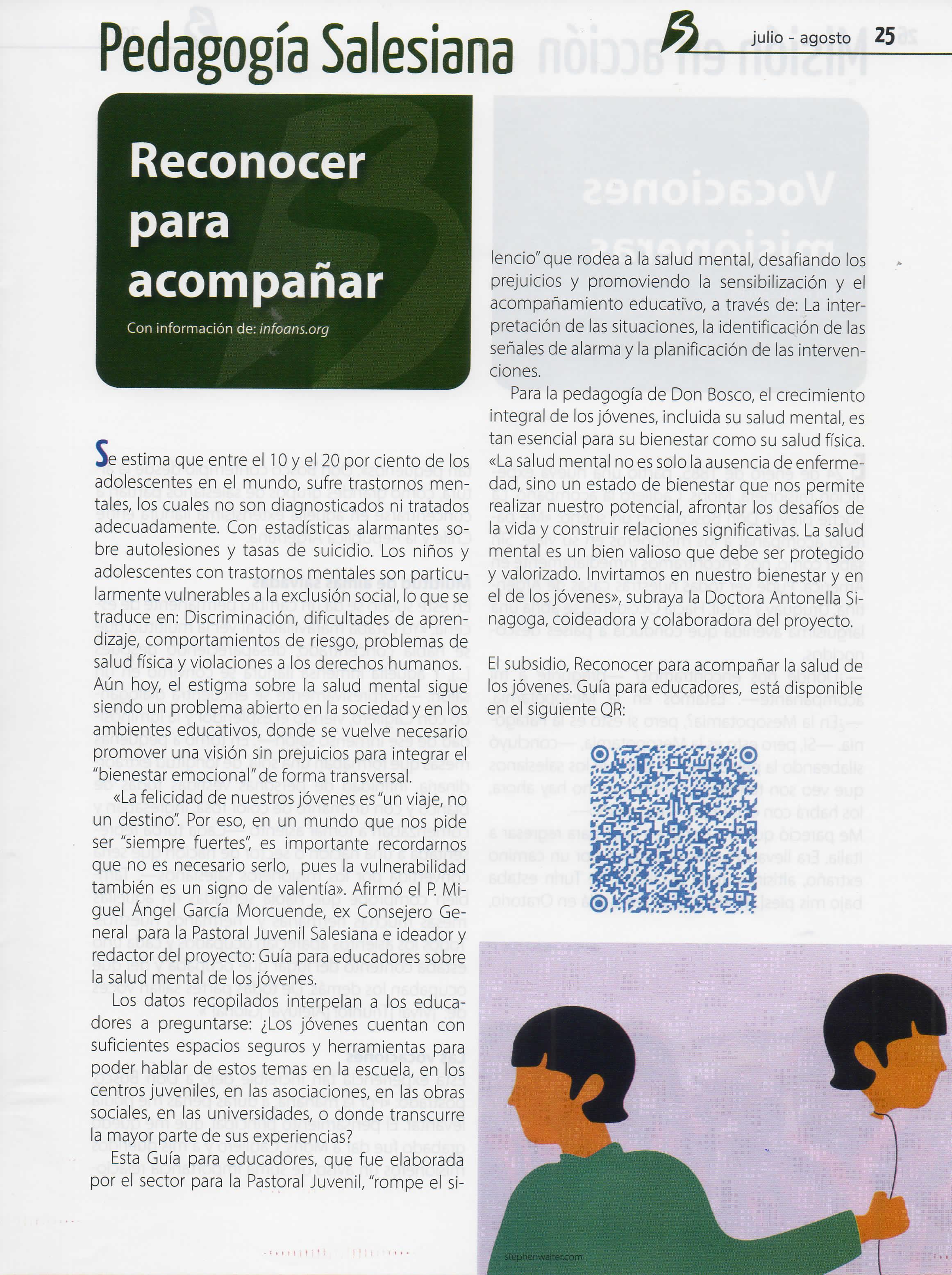 «La felicidad de nuestrosjóvenes es"un viaje, no un destino". Por eso, en un mundo que nos pide ser "siempre fuertes", es importante recordarnos que no es necesario serlo, pues la vulnerabilidad también es un signo de valentía».Afirmó el P.Miguel Ángel García Morcuende, ex Consejero General para la Pastoral Juvenil Salesiana e ideadory redactor del proyecto:Guía para educadores sobre la salud mental de los jóvenes