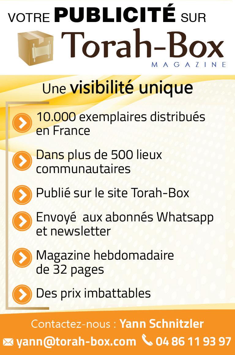 Responsable Publication : David Choukroun - Rédacteurs : Rav Daniel Scemama, Alexandre Rosemblum, Joana Abecassis, Jocelyne Scemama, Rav Yehonathan Gefen, Rivka Melki, Rav Avraham Garcia, Rav Gabriel Dayan, Binyamin Benhamou, Rav Yehiel Brand, Rav Its'hak Zilberstein, Murielle Benainous - Mise en page : Dafna Uzan - Secrétariat : 01.80.20.5000Publicité : Yann Schnitzler (yann@torah-box.com / 04 86 11 93 97) Distribution : diffusion@torah-box.com