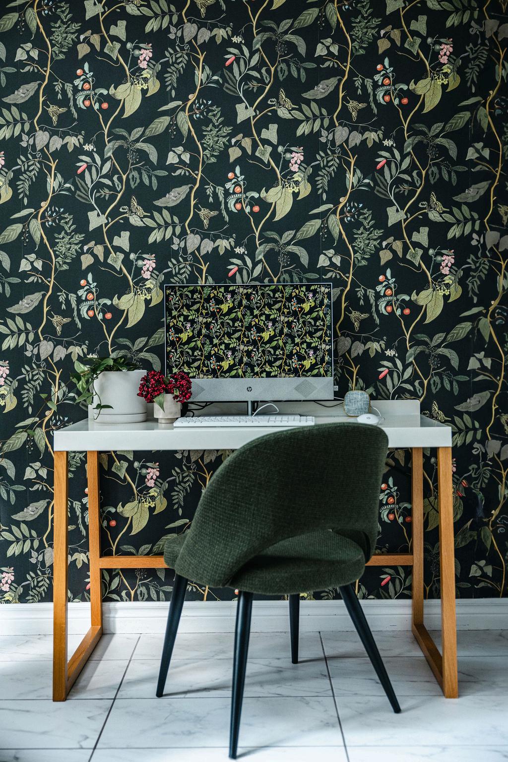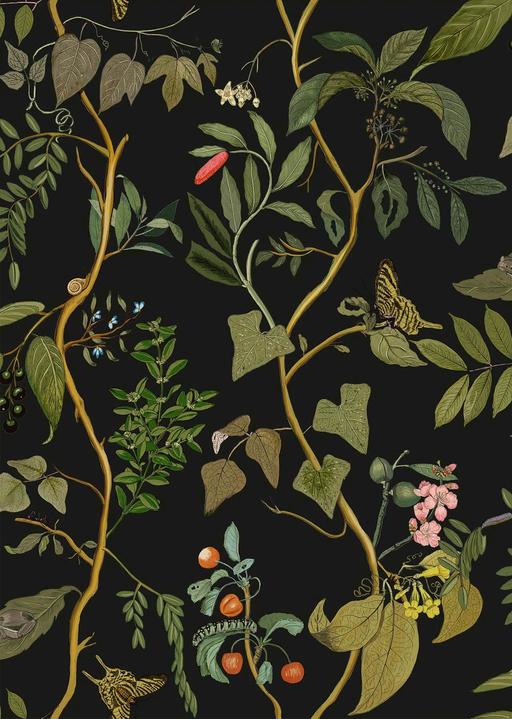 Enter the showstopper: Diderot Wallpaper. Inspired by the famed French encyclopedist, this magical design features a dreamy collection of exotic botanical specimens frogs, caterpillars, butterflies, and trailing leaves all perfectly in sync with the view beyond the windows. It was the bold, botanical embrace this hardworking space was waiting for