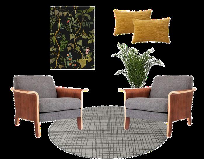 We brought in a beautiful rug to soften the s introduced wipeable (but supremely comfor chairs, and dialed up the drama with a bold wall, showcasing a commissioned installatio Jen’s favourite artists, Jessica Connors