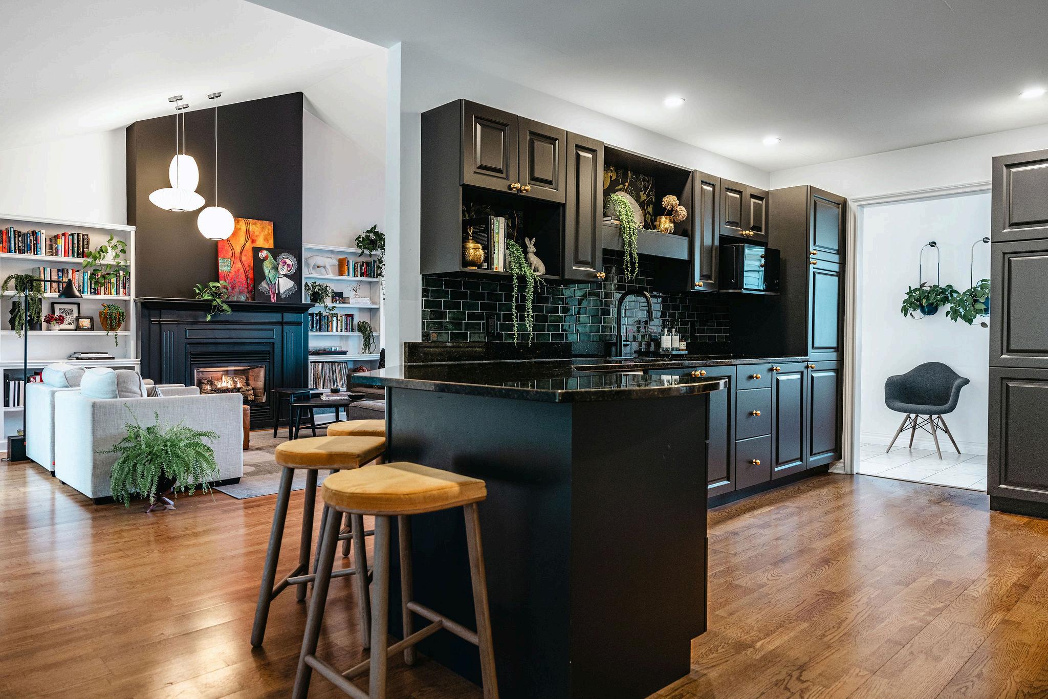 What started as a classic firsthome setup (white kitchen, minimal fuss) has evolved Ten years and two kids later, into a bold, personality-packed refresh. In the pages ahead, you’ll see a once bland kitchen go black and green (yes, really), a dining & living room revived, a sunroom reimagined, and a spare 8’ x 10’ bedroom turned into an adult lounge with a rum bar and sofabed.