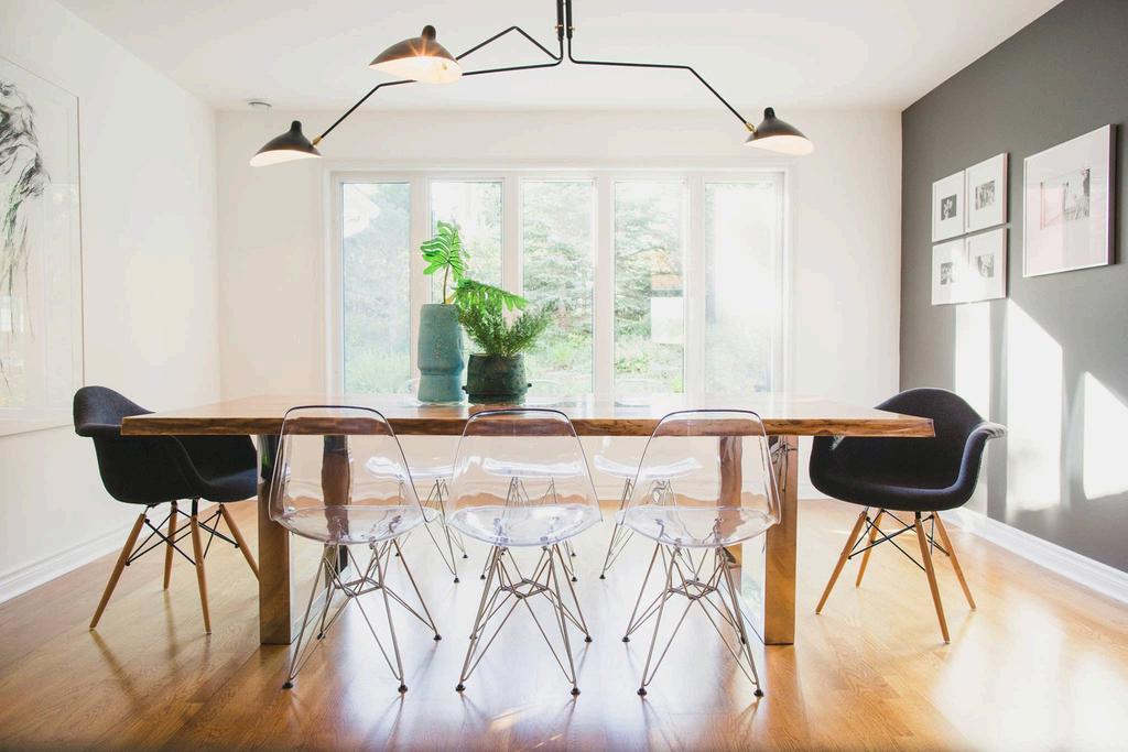 The dining room just steps from the kitchen has always been the heart of Jen and Dave’s home In the early days, we collaborated with Brent Rourke to create a timeless, handcrafted dining table as the anchor. But with two little ones in tow, practicality reigned: acrylic chairs, no rug, and a gallery wall of wedding and