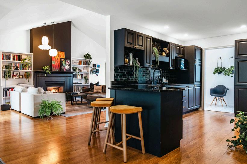 Enter peel-and-stick tiles a phrase I never thought I'd pitch, let alone champion. But the result? Honestly, it even surprised me. A bold coat of black paint turned the kitchen into the dramatic anchor of the home and sparked the full main-floor refresh. From the sun-drenched dining area to the cozy living room, from the lightfilled sunroom turned office to the clever reinvention of their youngest daughter’s old bedroom now a moody, adult-friendly lounge (complete with a rum collection!) and sofabed the transformation is both practical and deeply personal.