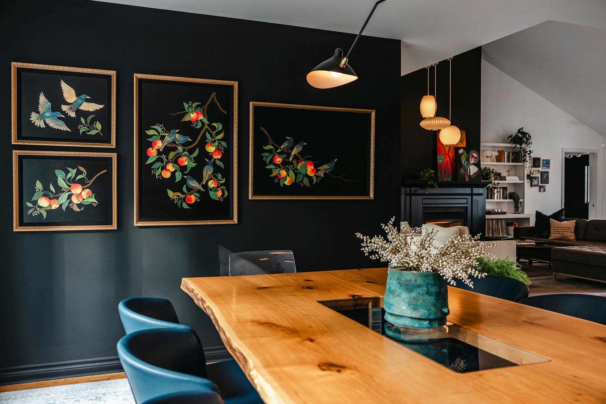 The simple dark wall and colorful paintings by Jessica Connors became the dining room’s focal point, anchoring the space with a refined energy that feels both bold and welcoming.
