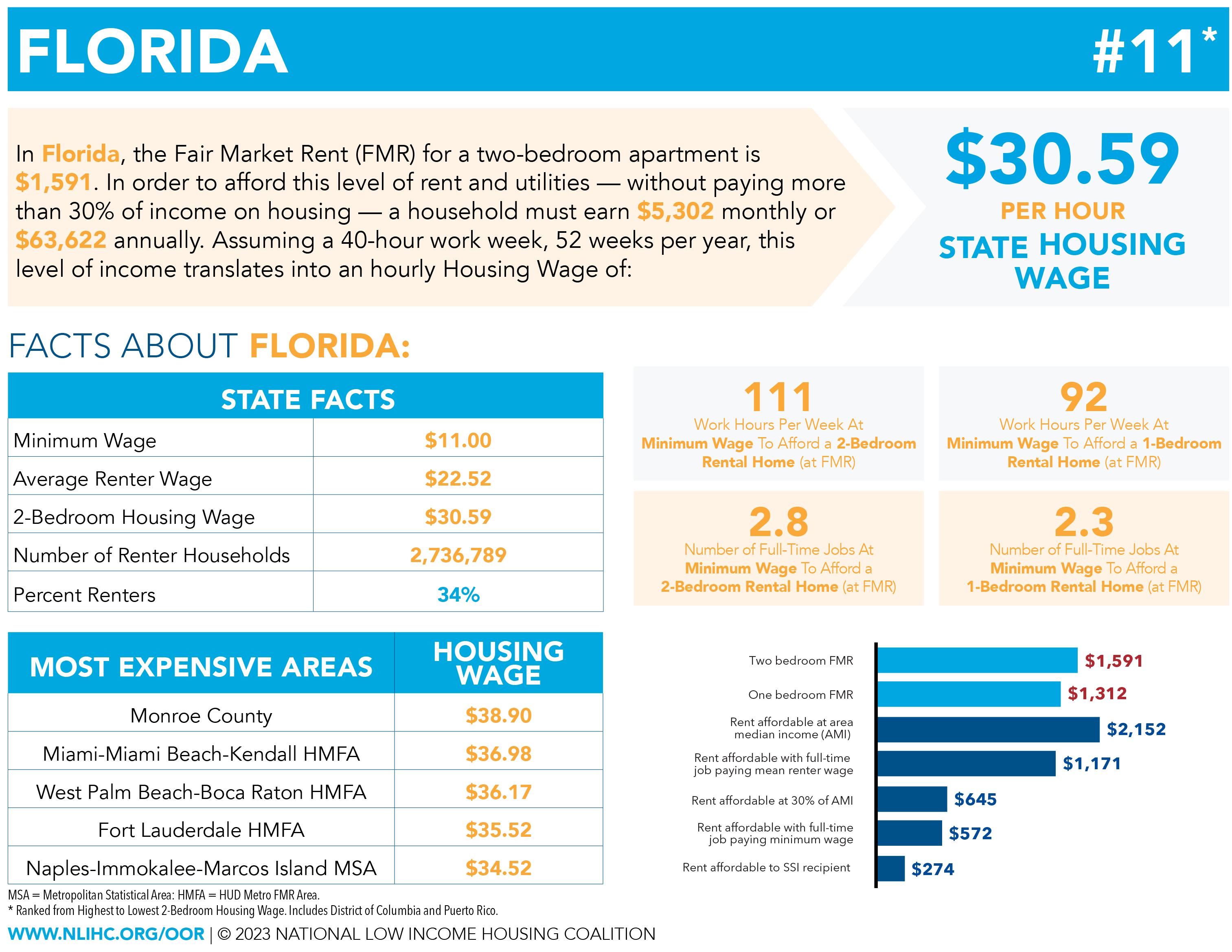 • Florida has only 23 affordable and available rental units for every 100 extremely low-income renters (those with incomes at or below 30% of the area median) No community in Florida provides enough housing to support this group which is primarily made up of low-income workers, retirees, and people with disabilities�