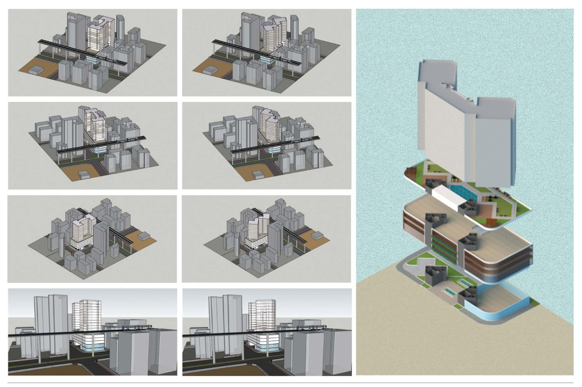 Exploring the relationship between residential units, podium design, and shared amenity spaces through coordinated 2D and 3D workflows. Typical floor plans, podium levels, and amenities layouts were developed in AutoCAD, focusing on clarity, efficiency, and spatial organization. In parallel, SketchUp massing studies were used to evaluate scale, form, and how the proposed building interacts with its surrounding urban context, supporting a cohesive and context-responsive design approach.