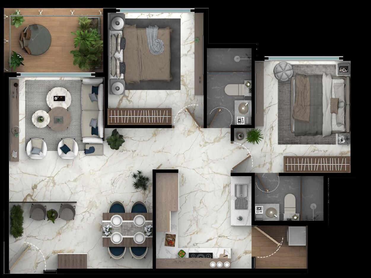 This panel showcases rendered floor plans across three unit types, highlighting spatial organization and furniture layout.