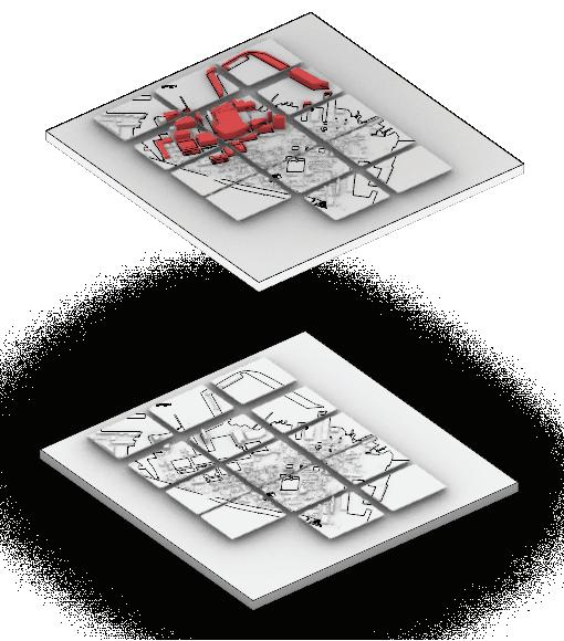 This map explores city-making as an urban game, where zones are distributed among players who strategically activate assigned voids through resilient intervention cards.