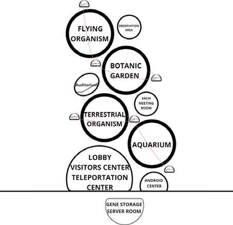 'Youtopia' is a vir tual theme park that people from 2070 can teleport to enjoy nature with animals and plants extinct at the time. 'Youniversal studio' is a biological research institute that restore the extinct and endangered species and present them in the built world theme park Youtopia. Also, it is a teleportation station for people from 2070.