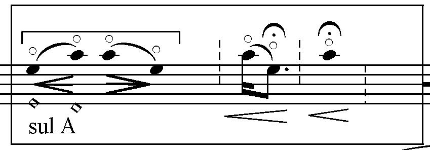 • This notation (used in the aleatoric boxes as described below from mvt. 1) indicates a tremolo of varying speed; start extremely slowly moving back and forth between the two notes, then gradually speed up into a true unmeasured tremolo. Then reverse the process.