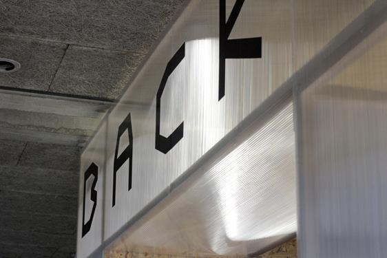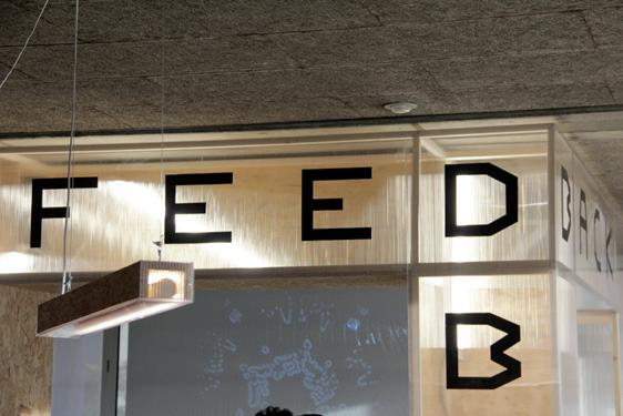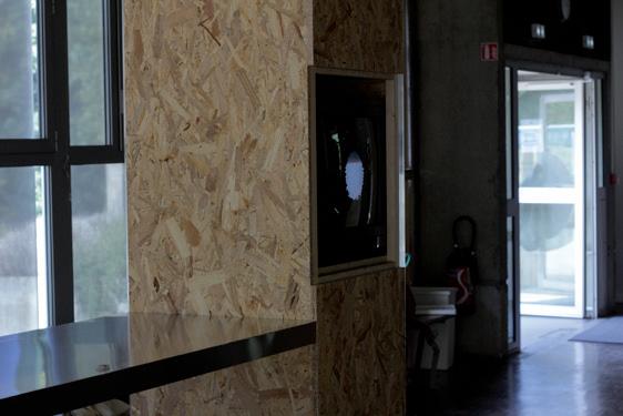 Ainsi, le projet comporte du mobilier fait en partie de chutes issues du grand cube. Ce dernier, quant à lui, est la structure fixe qui intègre le bar et l’installation vidéo. Il est composé sur le mode du feedback : un cube de 3m par 3m, fait de cubes de 0,6m par 0,6m autrement dit, une grille tridimentionnelle dont les détails évoquent l’ensemble, dont les parties renvoient au tout. L’installation vidéo, quant à elle, est un larsen continu, dont le circuit fermé est perturbé par le passage des visiteurs dans l’arche.