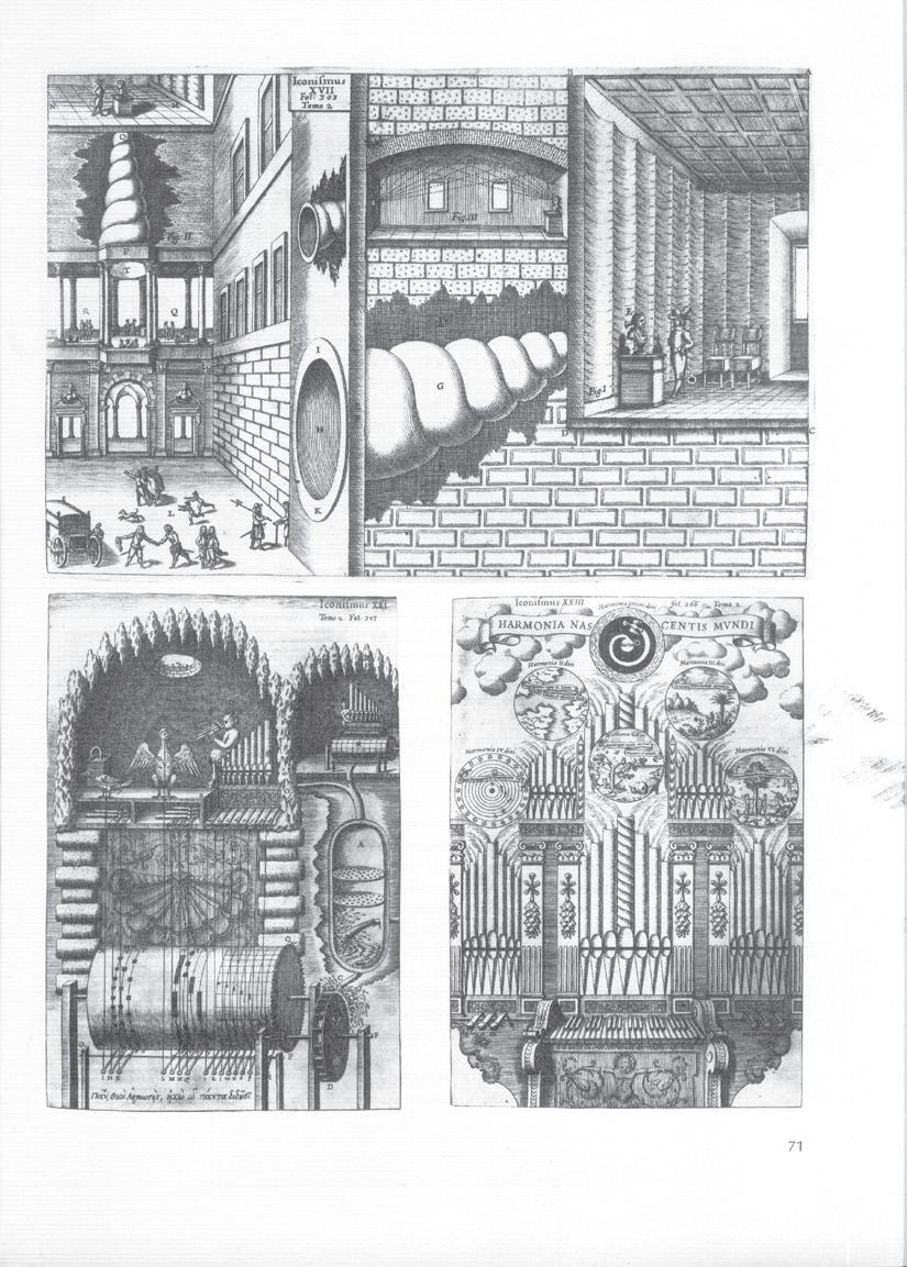 «Statues parlantes». Dissimulés dans des statues, différents dispositifs qui amplifient le son venant de l’extérieur, et le retransmettent dans une pièce, permettent par exemple au prince d’espionner ses sujets. Gravure provenant de Athanasius Kircher, Musurgia universalis, sive ars magna consoni et dissoni, Rome, 1650, II, p. 303.