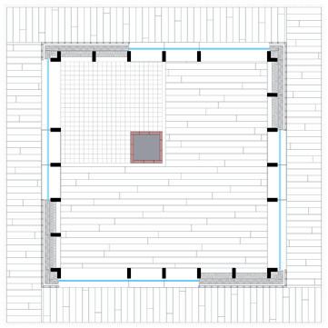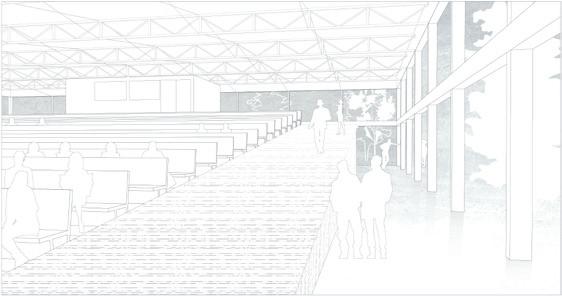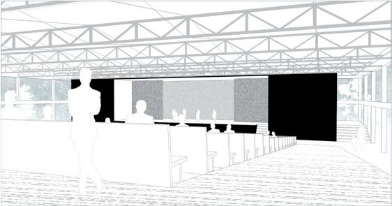 Projet La principale difficulté de ce projet fut de concevoir un bâtiment librement ouvert au public et à l’extérieur tout en gardant la possibilité d’en restreindre l’accès ou de le fermer complètement la nuit ou lors d’événements particuliers. C’est pourquoi sa peau est faite d’éléments mobiles : des rideaux métalliques rendent la façade transparente et changeante, et le toit est fait de toiles imperméables qu’on peut fermer si les conditions météo l’exigent. Ainsi, le projet a le caractère d’une tente : léger, minimal et perméable lorsqu’ouvert, ou affichant la forme claire d’un parallélépipède lorsque fermé.