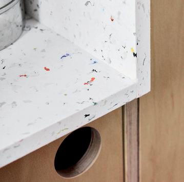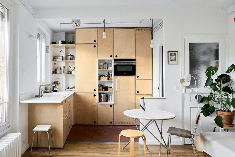 Projet La petite surface de cet appartement trois pièces nécessitait un projet compact. Une cloison a été abattue pour faire fusionner le salon et la cuisine, et des rangements sur mesure ont été conçus pour libérer le plus d’espace au sol. La cohérence du projet passe par une homogénéité des matériaux : du contreplaqué bouleau 18mm et du plastique recyclé 8mm et 18mm. Les matériaux d’origine ont tant que possible été conservés et restorés.