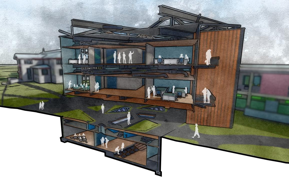 GIVEN THE OPPORTUNITY TO DESIGN A STUDIO ADDITION FROM CONCEPT PHASE TO DETAIL DOCUMENTATION PHASE , ARCHIVED CHALLENGED THE IDEA OF A TRADITIONAL RECTANGULAR BUILDING NOT ONLY IN RESPONSE TO ALLOWING MAXIMUM SUN INTO THE STUDIOS , BUT ALSO BECAUSE IT FORCED JESSICA AND I TO STRENGTHEN OUR KNOWLEDGE OF ARCHITECTURE THROUGHOUT THE SEMESTER , WE KEPT HOLD OF OUR SINGLE CONCEPT OF A CANTELIEVERED SAWTOOTH STRUCTURE AND WITH EVERY DECISION , WE KEPT THE FORM AT THE FOREFRONT WHEN IT CAME TIME TO PLACE IN THE STRUCTURE AND THE MECHANICAL SYSTEMS , THE CANTELIEVERED FORM BECAME A CHALLENGE - AND WHILE MANY SUGGESTED THAT OUR STRUCTURE TOUCH THE GROUND , WE REMAINED STRONG IN THE IDEA THAT THE STUDIO ADDITION SHOULD REMAIN CANTELIEVERED ALTHOUGH THE UNIQUE FORM PRESENTED MANY CHALLENGES , I AM PROUD TO SAY THAT JESSICA AND I DID NOT GIVE UP ON OUR SAWTOOTH STUDIO DESIGN AND IN TURN PUSHED US TO BECOME BETTER DESIGNERS WHO CHALLENGE WHAT ARCHITECTURE IS AND CAN BE