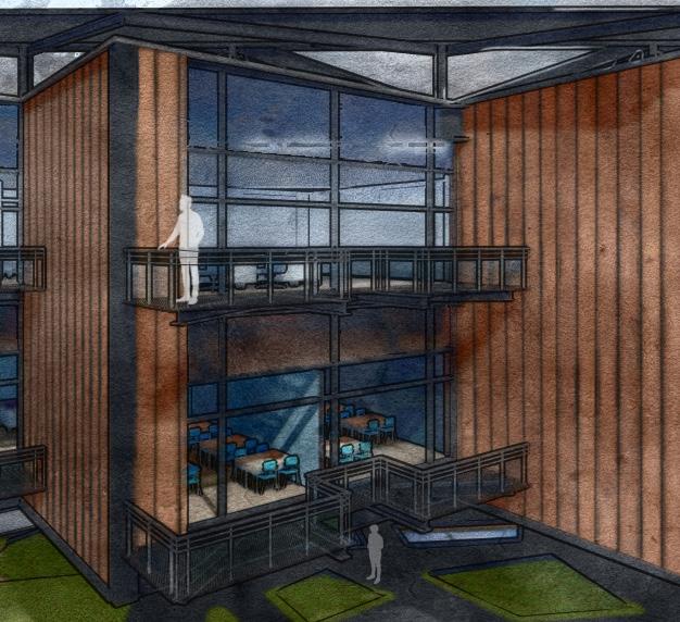 TO MANAGE THE EXCESSIVE SUN, WE DECIDED TO INTEGRATE BALCONIES ON THE SOUTHERN SIDE TO ACT AS A SHADING DEVICE SECONDLY, SLOPED ROOFS TO THE SOUTHEAST WERE APPLIED TO ALLOW MORE SUN INTO THE CENTRAL SPACE OF THE BUILDING