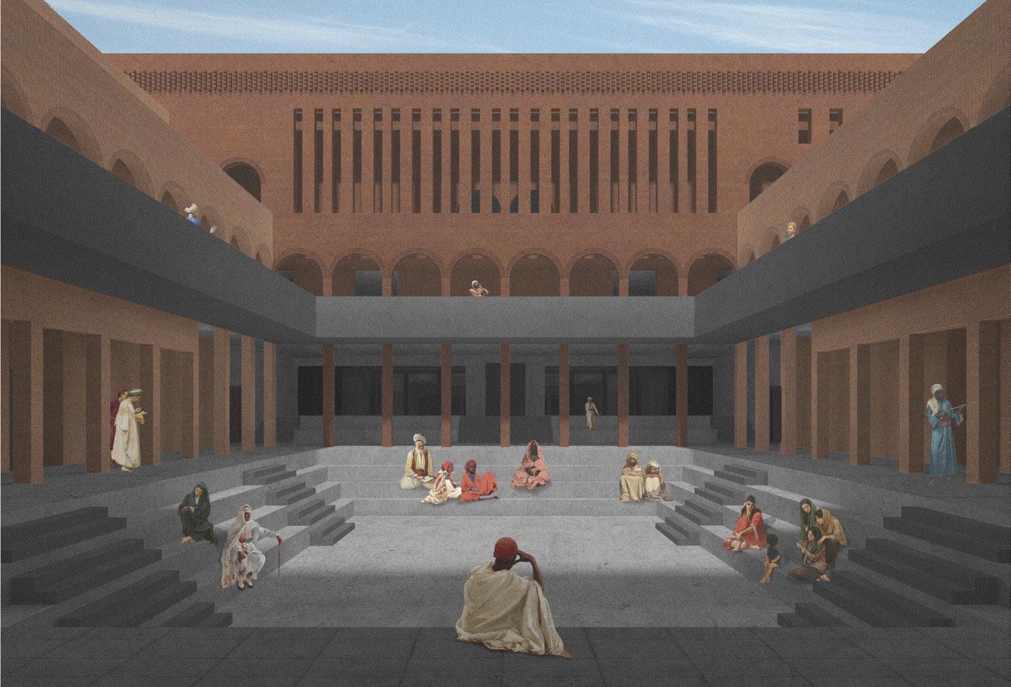 Create a post-war cultural hub that preserves and celebrates Iraqi heritage. Develop design that blends traditional and modern elements, with multifunctional exhibition spaces.